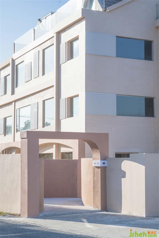 光之于空間,猶如空氣之于生命,我們花溪民宿改造設(shè)計格外重視光影的營造。在整修室外空間時,首先對門窗進行重裝,考慮到造價問題,我們沒有對建筑外立面進行大的修改,只是做了拆除與粉刷,用大面積的粉色確立起整間民宿的視覺特征。在挑選外立面裝飾時,十分注重“自然采光”的原則,用穿孔板形成塊狀感,巧妙地利用自然光線突出室內(nèi)環(huán)境的層次,營造出斑駁陸離、明暗有致的視覺效果。
