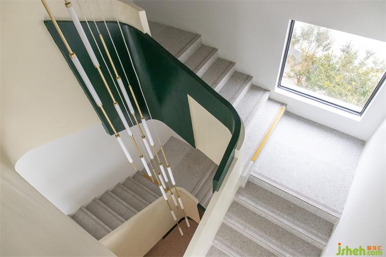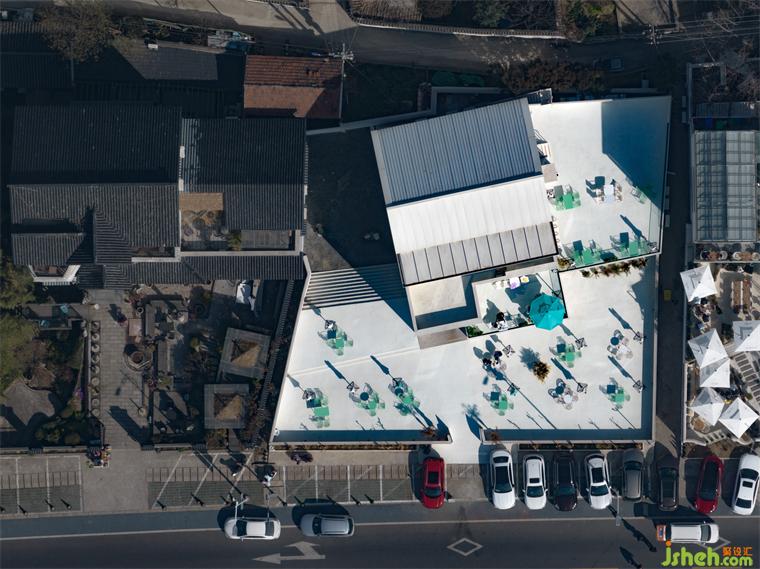 Thanks to the demolition of the original windows and doors, the old building and the new added part are more coherent and the usable area has been expanded a lot. We put the bar counter into the space by attaching the old and new walls, so that the whole hall can connect and radiate the whole space with the coffee bar as the core. The longer bar uses a circular arc at the junction of spaces to guide people to the other end of the space. The new built auxiliary building on the right is used as an area where the owner usually receives some personal friends. The space as a whole is dominated by clean and tidy white tones, and some colors are dotted on the furniture. The indoor ceiling and stairs use stacked arcs as the basic language components to wrap the space, just like the backflow collision when the lake water is pushed to the shore and splashes.