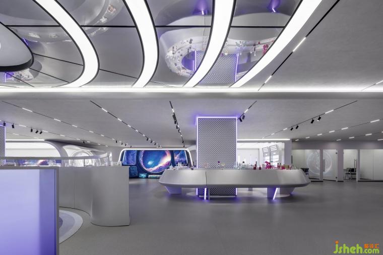 “天地玄黃,宇宙洪荒,日月盈昃,辰宿列張?!?,人們從古至今,從未停止過對宇宙時空的探索,宇宙的未知性與神秘性使得它成為了人們對未來的探索路徑之一。展示著廣袤無垠宇宙的巨大顯示屏,白紫相間的線性燈帶猶如跳動著的不規(guī)則星系將旅客們從打開電梯門的一刻瞬間便拉入到未來時空的旅途當(dāng)中。在安特未來靈感艙來一場穿越星際的未來探索,融入全新的科技元素,結(jié)合化妝品展廳打造了一個沉浸式未來風(fēng)格的感官盛宴。