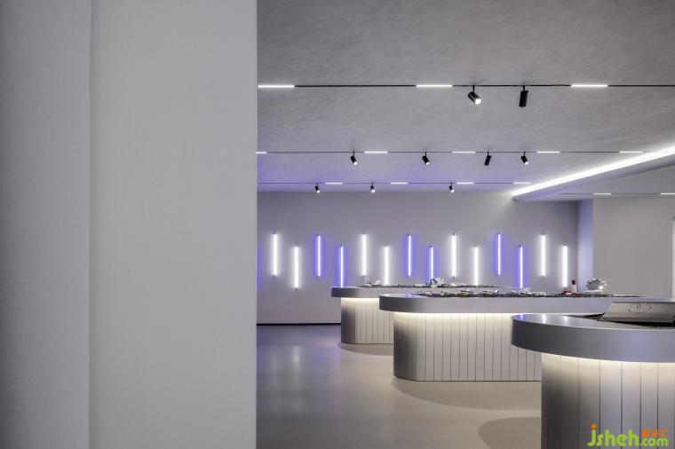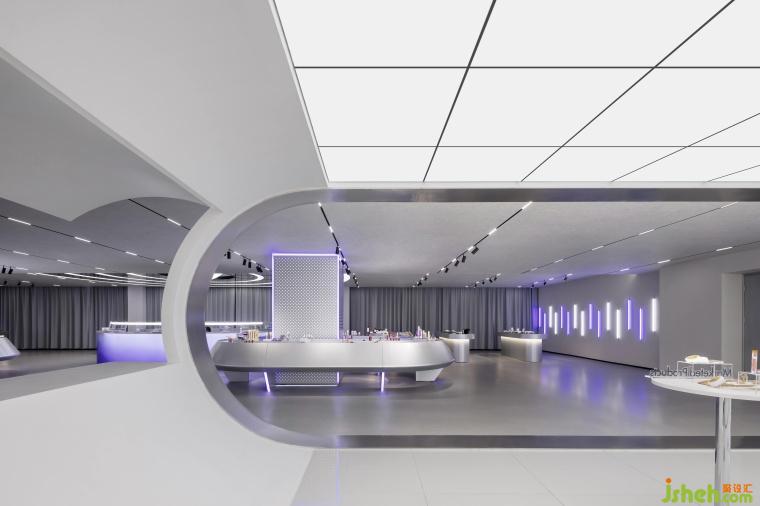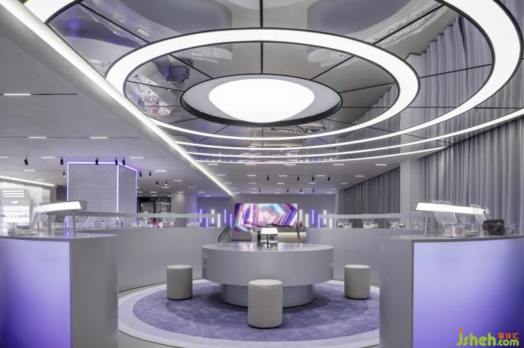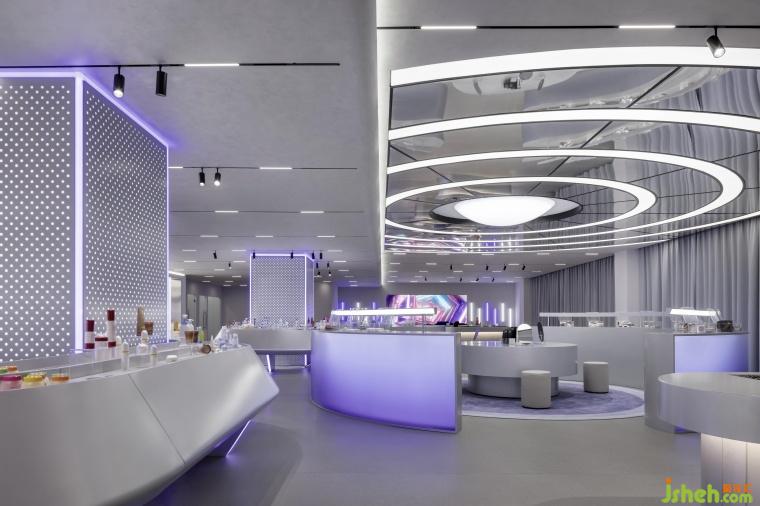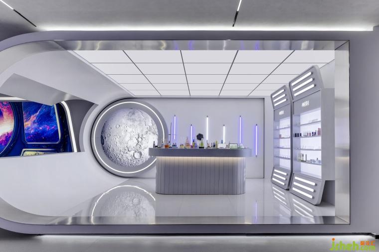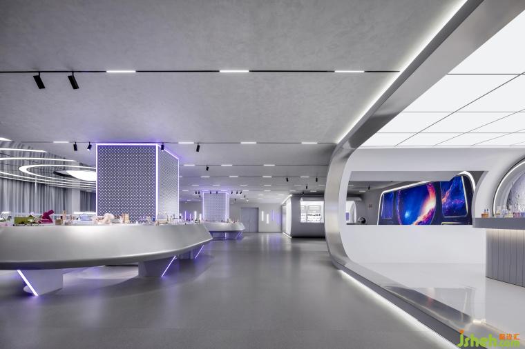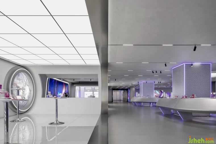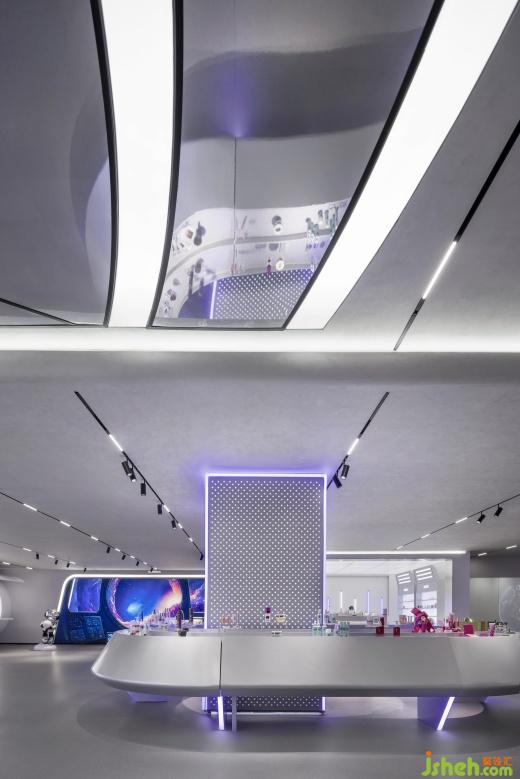 在燈光營(yíng)造方面,巨大顯示屏展示廣袤宇宙,配合白紫相間的線性燈帶,像跳動(dòng)的星系,瞬間將人帶入未來(lái)時(shí)空;“太空艙體驗(yàn)區(qū)” 的環(huán)形燈帶搭配銀灰色金屬材料,LED燈如璀璨星河,增添夢(mèng)幻感。空間構(gòu)建上,化妝實(shí)驗(yàn)艙的弧形設(shè)計(jì)搭配網(wǎng)格拉膜天花,模擬太空艙環(huán)境;實(shí)驗(yàn)艙的觀察窗,透出的真實(shí)世界與宇宙奇觀形成對(duì)比,增加空間層次,以往商品陳列區(qū)的傳送帶元素模擬物資運(yùn)輸,兼具功能與科技感。