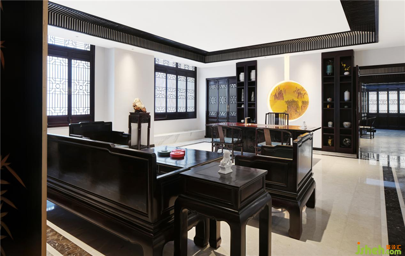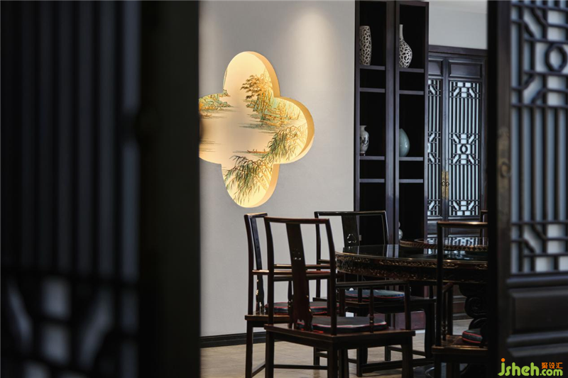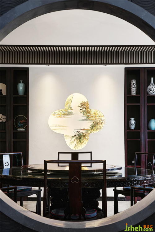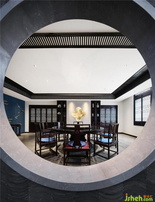 二進營造吃飯喝茶的餐食區(qū)域,設計了圓桌,這是傳統(tǒng)中國人就餐的方式,配備暗門的廚房。南京會所設計上與第一進和第三進相連,所有圍合的花格門皆可打開,閉而不合,不豎實墻。