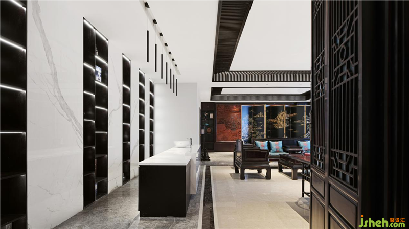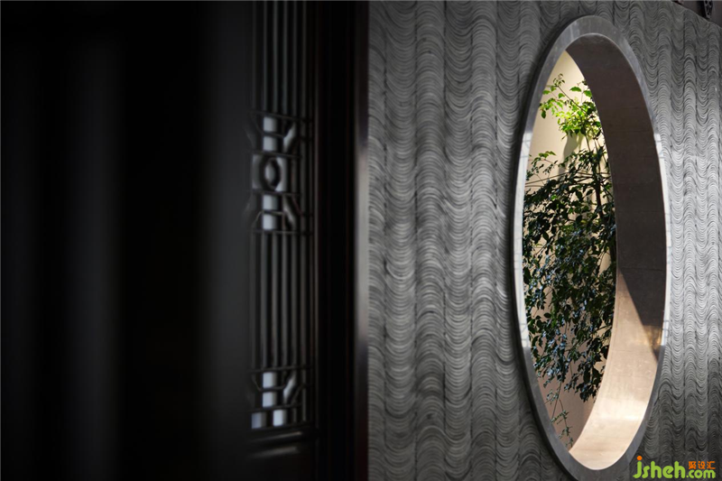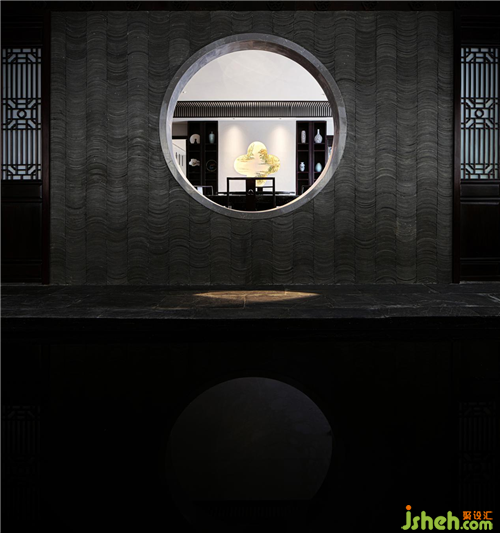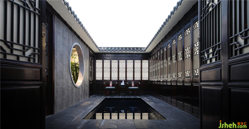 在第一進室內(nèi)空間,營造模擬的天井院落,綠植,流水,假窗等,遵循中國式的浪漫主義,即“誰道江南風景佳,移天縮地入君懷”,由“園”到“室”,這是中國人對于“天人合一”的一種追求。頂部發(fā)光的燈膜吊頂及墻面發(fā)光的玻璃窗,似乎這即是天光。