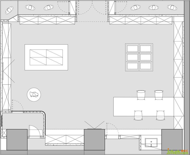 整個(gè)空間,我們沒(méi)有去設(shè)計(jì)沙發(fā)軟座,而是把擺臺(tái)作為交流島的方式使用,一方面是因?yàn)榭臻g的局促性,另一方面,南京店鋪裝修設(shè)計(jì)師需要在這90平米的空間里,可以滿足三組客人停留并選樣。所以我們?cè)O(shè)定了三個(gè)接待區(qū),即服務(wù)臺(tái)和兩個(gè)展品島。