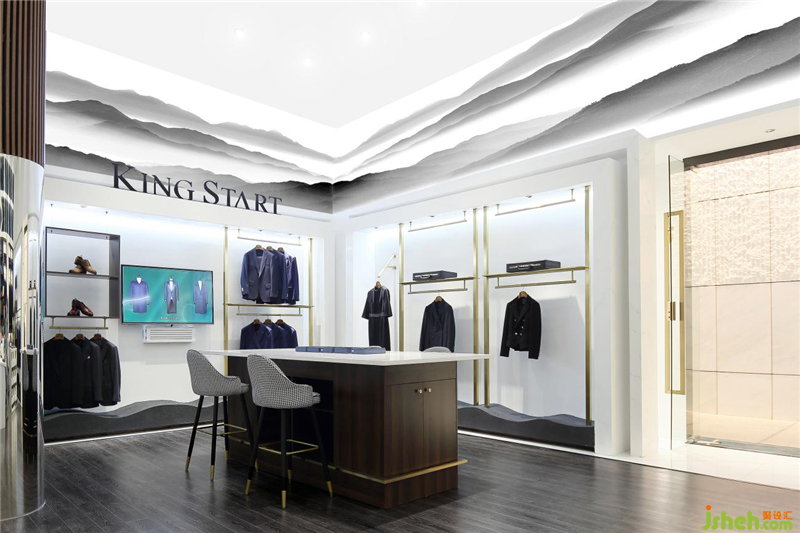 KING SATART高級(jí)成衣定制店,是我們所接觸的他們的第二個(gè)項(xiàng)目,位于河西金奧費(fèi)爾蒙酒店一層,因?yàn)橐恍┈F(xiàn)場(chǎng)條件的限制,這個(gè)項(xiàng)目是對(duì)原有空間的一個(gè)改造。現(xiàn)場(chǎng)層高4.6米,在不做頂部區(qū)域改動(dòng),并無(wú)法利用挑空做功能使用的情況下,南京店鋪裝修設(shè)計(jì)我們引用“忽聞海上有仙山,山在虛無(wú)縹渺間”的概念,把上部空間做成了發(fā)光的遠(yuǎn)山的形式,而空間的下部區(qū)域,以人的尺度最大滿足展示及儲(chǔ)藏需求。