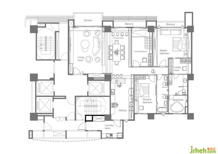 餐廳與廚房間以開放關(guān)系,導(dǎo)讀生活…結(jié)合懸挑式吧臺(tái)設(shè)計(jì)、復(fù)古地磚拼貼的地材設(shè)計(jì),聯(lián)袂彼此生活互動(dòng),還原、引申戶外公園綠景景況的自然意趣;復(fù)式設(shè)計(jì)任由自然光源映襯著材質(zhì)產(chǎn)生溫潤表情,使得整個(gè)廳區(qū)表情顯得開闊而舒適。設(shè)計(jì)上將客用衛(wèi)浴以二進(jìn)式設(shè)計(jì),規(guī)劃男孩房套房形式,也滿足訪客使用機(jī)能。