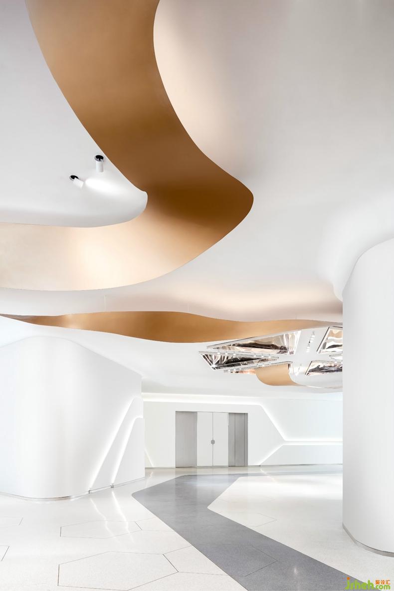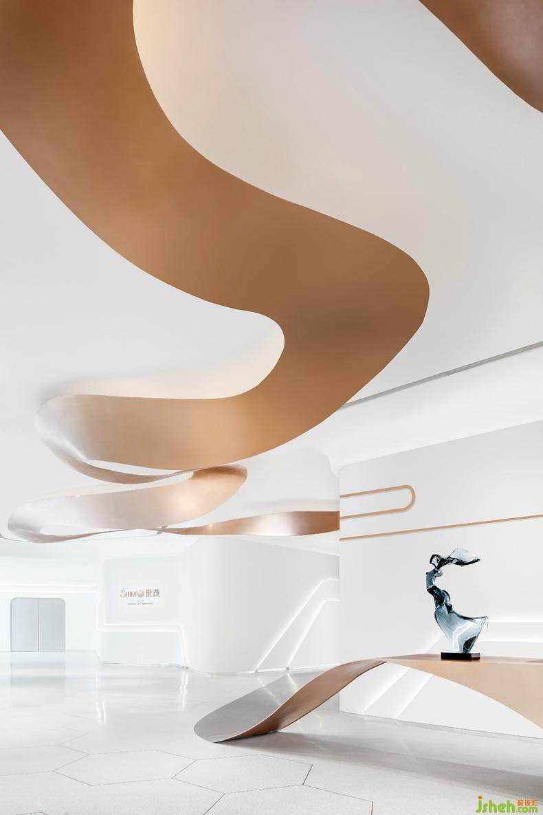 延展的畫卷形成空間的視覺(jué)焦點(diǎn),從建筑外圍延續(xù)到室內(nèi),優(yōu)美的長(zhǎng)卷雕塑,如行云流水般上下貫穿,延續(xù)到接待臺(tái)、再延伸到地面、吧臺(tái)、樓梯,綿延生長(zhǎng)。