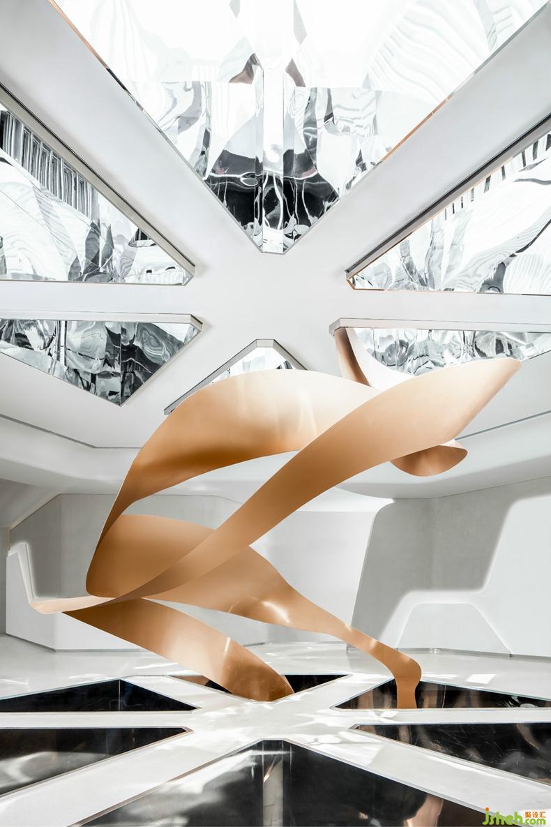 六合廳作為建筑的中心,與天空對(duì)視的精神空間,想達(dá)到底層便可看到云朵的空間構(gòu)想。四周墻體,由六組相同的藝術(shù)墻體,形成圍合感和儀式感都很強(qiáng)的獨(dú)特空間。作為精神空間,以建筑手法體現(xiàn)干凈與純粹的設(shè)計(jì)味道。
