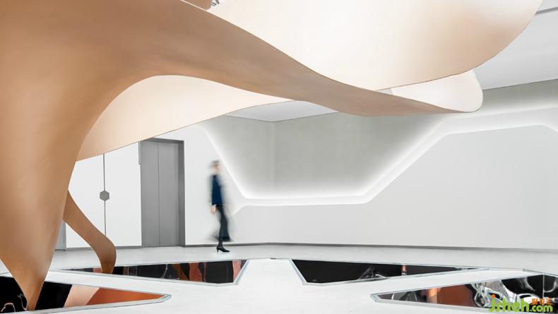 每個(gè)三角形的中空結(jié)構(gòu)的內(nèi)壁都是鏡面不銹鋼,形成一個(gè)空間萬花筒,通過光影的折射,畫卷、天空、室內(nèi)環(huán)境,共同形成了一個(gè)變化豐富的視覺亮點(diǎn)。