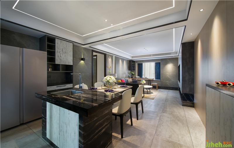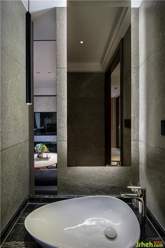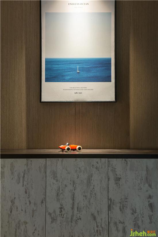 干區(qū)與沙發(fā)背景連為一體“借”客廳的一縷光線使整個空間更顯得通透,從干區(qū)往客廳看增加了美感,在不同光線的作用下,自然細(xì)密的肌理顯露出不同層次的色彩,方寸間勾勒出碎碎念與小歡喜,層層鋪開溫馨的生活碎片。