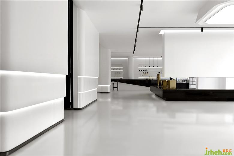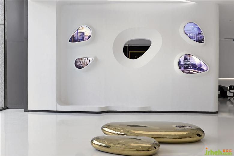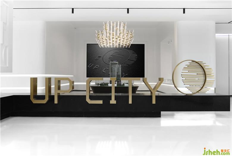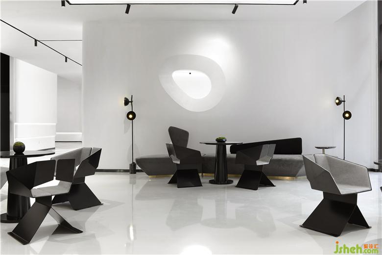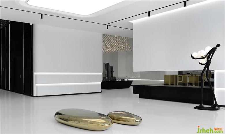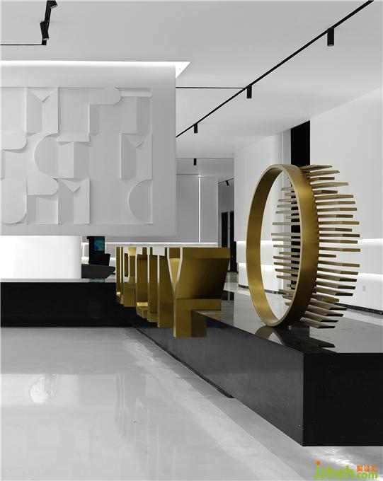 留白,源自于中國(guó)傳統(tǒng)繪畫(huà)的構(gòu)圖技巧,以無(wú)形繪有形。在黑與白之間,描刻出形與神的深邃意境,留予人無(wú)限的想象。被這一處白吸了眼,幾縷似水般的光帶,在空間中自由地游走,身影徘徊于明亮與陰影之中,不自覺(jué)的被頂面一道道搖曳的光所吸引著,引導(dǎo)訪客其中漫游,思考,流連。設(shè)計(jì)師拿捏著空間的尺度,通過(guò)對(duì)形體、色彩、質(zhì)感、軟裝來(lái)營(yíng)造一個(gè)頗具性格的藝術(shù)之域,用造型的變化替代多材料的裝飾手法。折線射燈與立面造型相結(jié)合,相應(yīng)可產(chǎn)生深淺變化,形成層次。作品在環(huán)境風(fēng)格上還是取用黑與白之間的對(duì)比,金色為點(diǎn)綴,克制與取舍往往才是走向無(wú)限的通幽之徑。售樓處設(shè)計(jì)