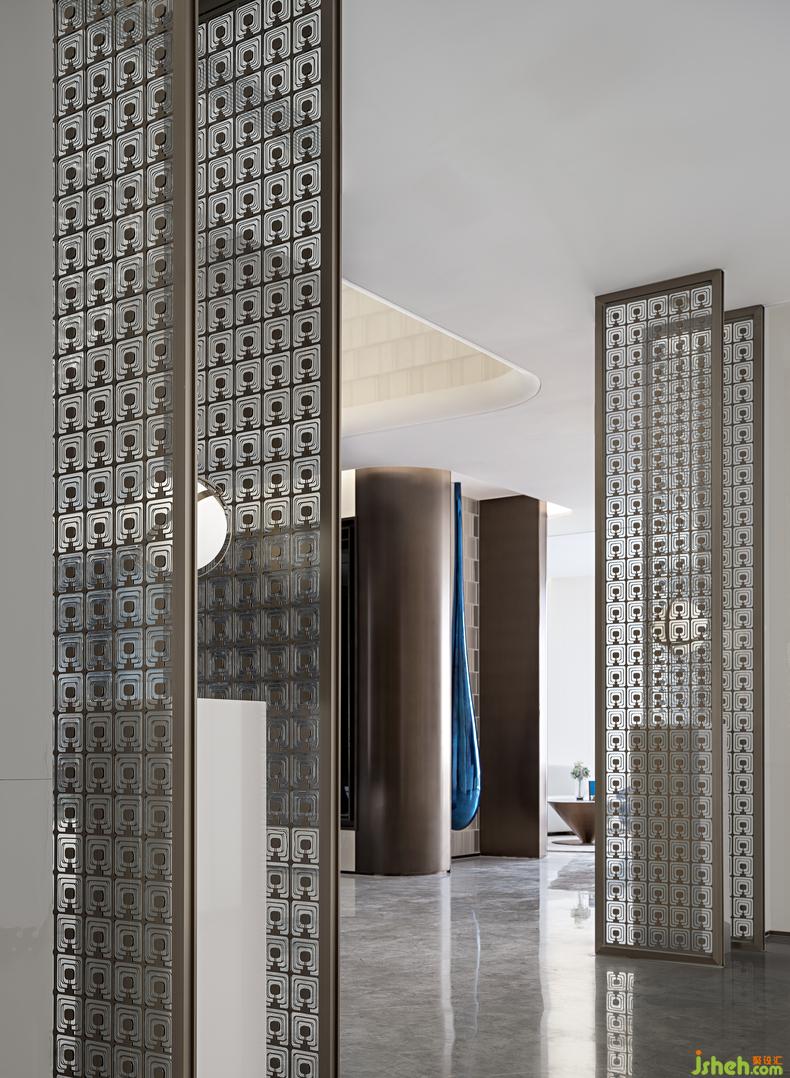 初入前廳,極具視覺沖擊力的格柵門簾首入眼里,古典園林中的洞門,嫻靜文雅的吊燈,都在流露著中華傳統(tǒng)文化柔潤婉轉(zhuǎn)的美學(xué)追求。