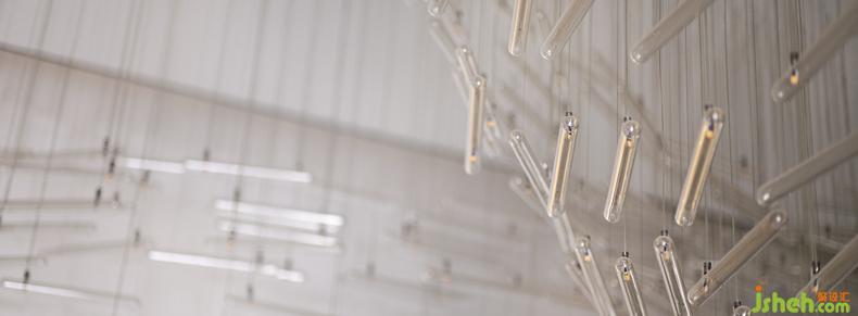 遠(yuǎn)看沙盤區(qū)的天花吊燈,運(yùn)用線條的不同性格,曲線的動感與旋轉(zhuǎn),賦予空間多變的情緒,讓人產(chǎn)生流動的時(shí)光感和力量感。