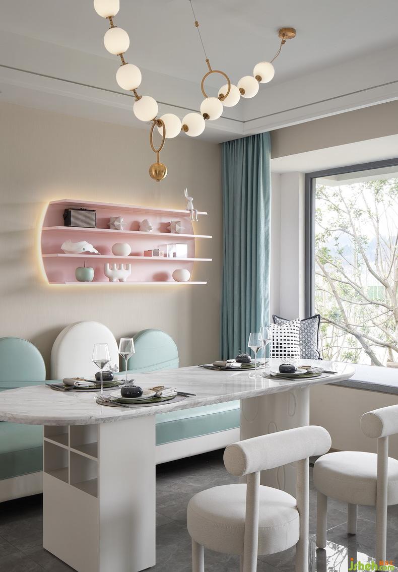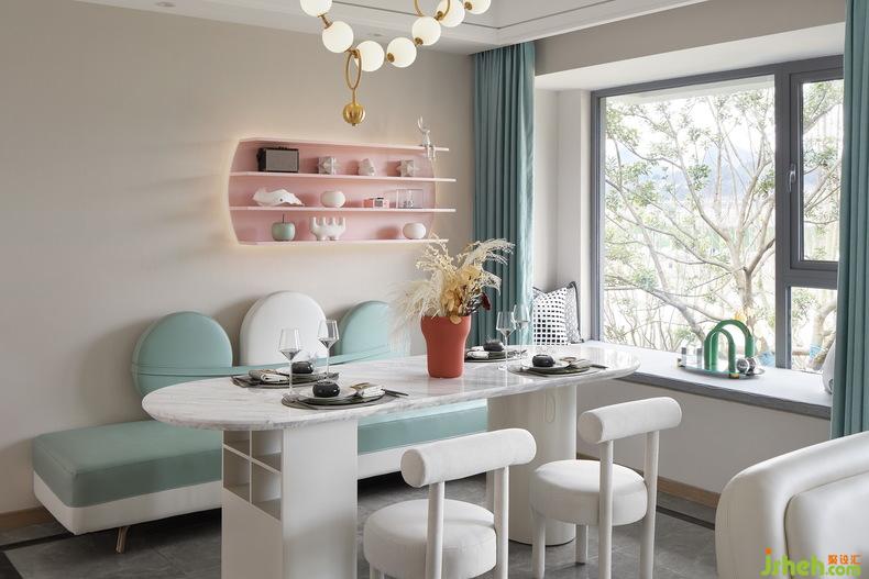 利用馬卡龍色系普遍建立的大眾色彩認(rèn)知,讓平凡的空間瞬間就有了浪漫、樣板間設(shè)計(jì)夢幻、童話、跳躍的氛圍。單只用了顏色這一個(gè)元素,就讓難以描述的氛圍感躍然呈現(xiàn)。