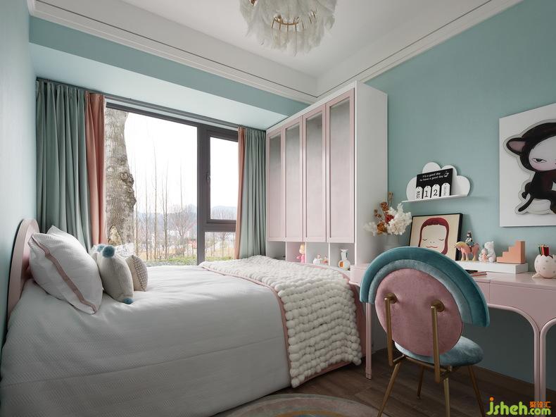 女孩房里,色彩運(yùn)用達(dá)到極致。藍(lán)色的墻體,粉色的衣柜與書(shū)桌,樣板間設(shè)計(jì)配以米色的床品,再加上書(shū)桌上的一副卡通人物畫(huà),集齊所有夢(mèng)幻的顏色、浪漫的形式。