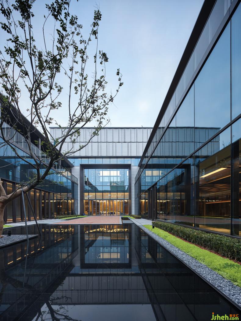 整個(gè)空間前后三進(jìn),層層遞進(jìn),極具中式空間的含蓄與神秘之感。前后入口皆為亭,中部接待區(qū)稱(chēng)為堂,亭堂連接之處謂之廊,三者圍合起來(lái)便是“院”了。 每一境都自成一派,又整體歸一,既開(kāi)放又包容,顯然將空間探尋的主動(dòng)權(quán)讓渡于步入者:或?yàn)楸叹G高枝吸引,或?yàn)殓R面水光駐足,或欲沉入深邃,便擇幽靜長(zhǎng)廊小步徘徊,獨(dú)處慎思。