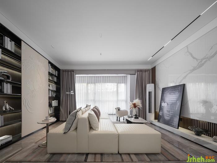 在功能布局上,設(shè)計(jì)師在客廳處刻意選用雙面可坐沙發(fā),并置入書柜,使得客廳兼具書房功能,延展空間使用價(jià)值。以手工皮雕包裹的書柜滑動(dòng)門,復(fù)古優(yōu)美,亦是空間的焦點(diǎn)與特色之一,兼具實(shí)用性與裝飾性。