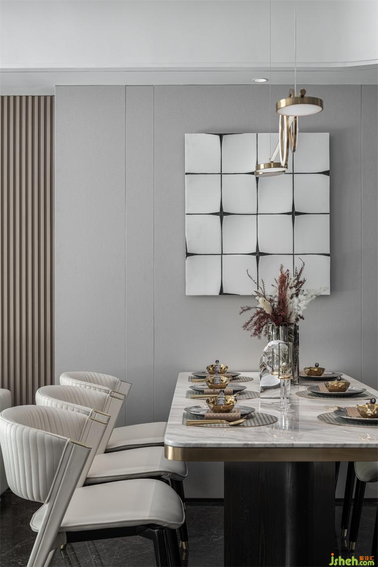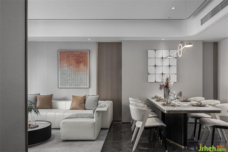 客廳、餐廳、西式廚房一體化設(shè)計(jì),空間通透而舒展,樣板間設(shè)計(jì)相鄰空間既可自由互動(dòng)又彼此獨(dú)立。皮質(zhì)、金屬、石材,不同的材質(zhì)肌理達(dá)成視覺(jué)與觸覺(jué)的精致和諧,于低調(diào)內(nèi)斂中展現(xiàn)生活的質(zhì)感與優(yōu)雅。簡(jiǎn)約格調(diào)的墻面掛畫為空間增添一份藝術(shù)的氣息,同時(shí)也為空間注入一份精神內(nèi)涵。