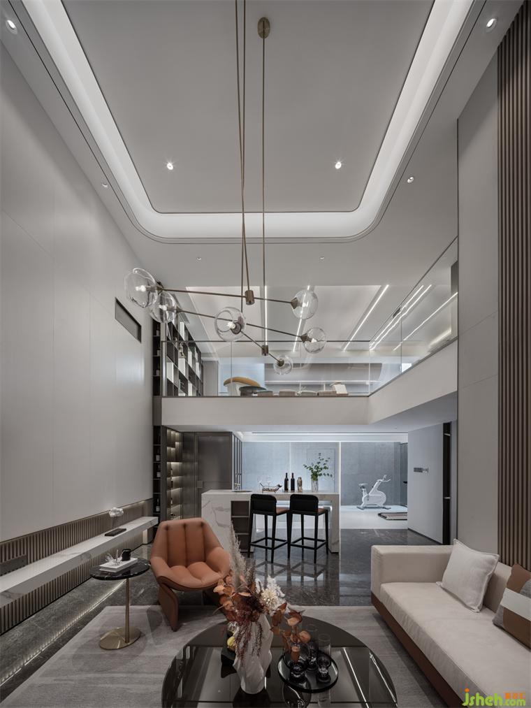 會客廳挑空處理,彰顯空間的沉穩(wěn)大氣,刪繁就簡設(shè)計手法,賦予空間更強的包容性。墻面獨具秩序美感的木飾面與大面積留白形成拼接對比,簡單中散發(fā)出高級的幾何之美。L型沙發(fā)與獨立座椅圍繞圓形茶幾擺放,樣板間設(shè)計構(gòu)筑場所的聚合感,與繁華保持著若即若離的關(guān)系,享受生活的悠閑與豐盈。