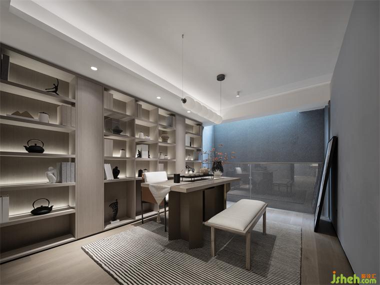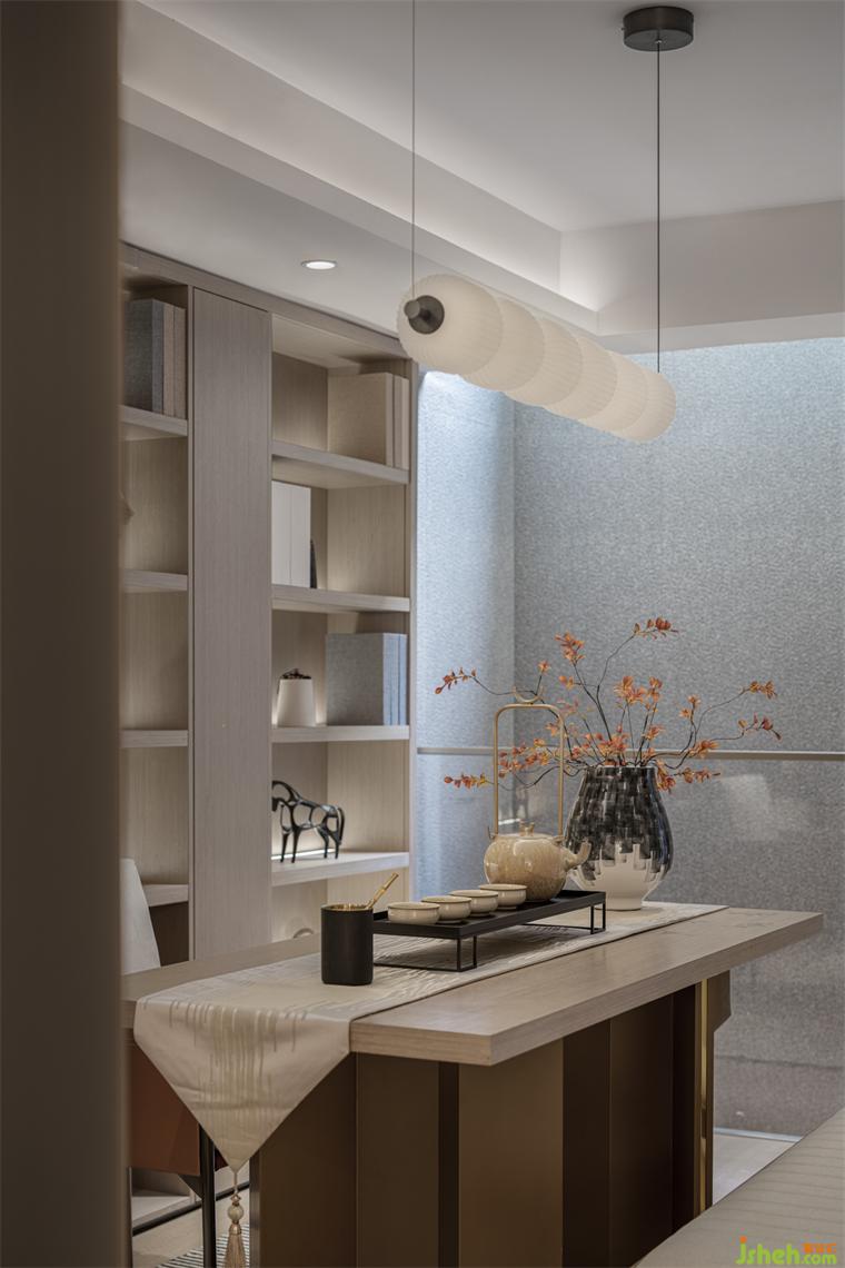夾層書房,設(shè)計師特意選用木、瓷、紙等東方美學(xué)元素點綴空間,樣板間設(shè)計居者可在此靜心品茗賞味、恣意揮灑筆墨、或自在把弄古玩。沉浸式場景打造,賦予空間文人雅士般的氣質(zhì),靜享生活的淡泊與寧靜。
