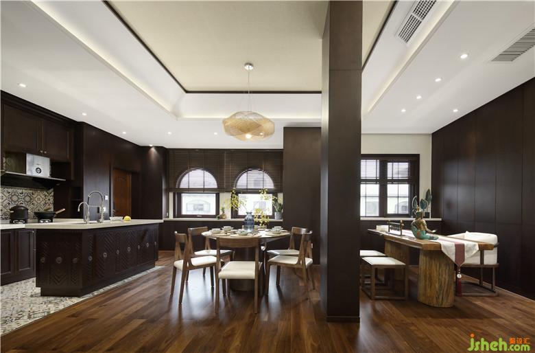 餐廳開放式空間以質(zhì)樸溫馨的中性色彩為主,采用實(shí)木的餐桌、座椅,純天然的材質(zhì)散發(fā)出自然的氣息。在裝飾品局部的細(xì)節(jié)上點(diǎn)綴鮮艷的黃色蝴蝶蘭自然溫馨中又帶著明快和熱情,這也是整個(gè)家給人的印象,沉靜與熱情并存。中西廚并兼,考慮到后期使用,室內(nèi)設(shè)計(jì)師運(yùn)用了小花磚的背景墻與地面,在整個(gè)空間中格外引人矚目??罩刑倬幍鯚艉筒妥酪涡纬闪撕魬?yīng),自然、古樸。