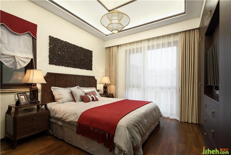 主臥室則體現(xiàn)了主人的品質、生活情調以及生活的私密性。榆木木雕的裝飾畫、床頭柜泰式臺燈、頂面藤編吊燈,主臥室的原始建筑窗采用東南亞傳統(tǒng)的窗簾樣式進行裝飾,彼此相映成輝,古樸的東南亞民族風情不彰自顯。
