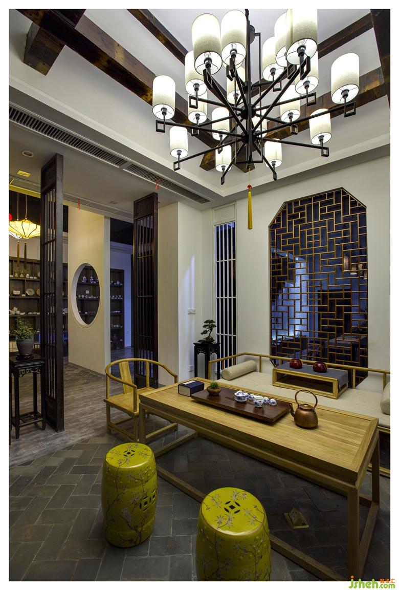 合圍的客人接待區(qū)素木桌椅古色古香,十足雅致的茶具、年份久遠(yuǎn)的陳茶好似穿越了時(shí)間的界限,這種繁花落盡的細(xì)微之美滲透了東方華夏幾千年的文明,安靜了世界的浮華。一條長(zhǎng)達(dá)4米多的條形案臺(tái)映入眼簾,這是茶室的公共區(qū)域,枯枝在角落中找到了支撐點(diǎn),傲然蕭瑟,美得別致,案臺(tái)旁配以精美石凳,栩栩如生的圖案,鮮亮的顏色并不跳脫,反而帶動(dòng)了空間的生機(jī)活力。