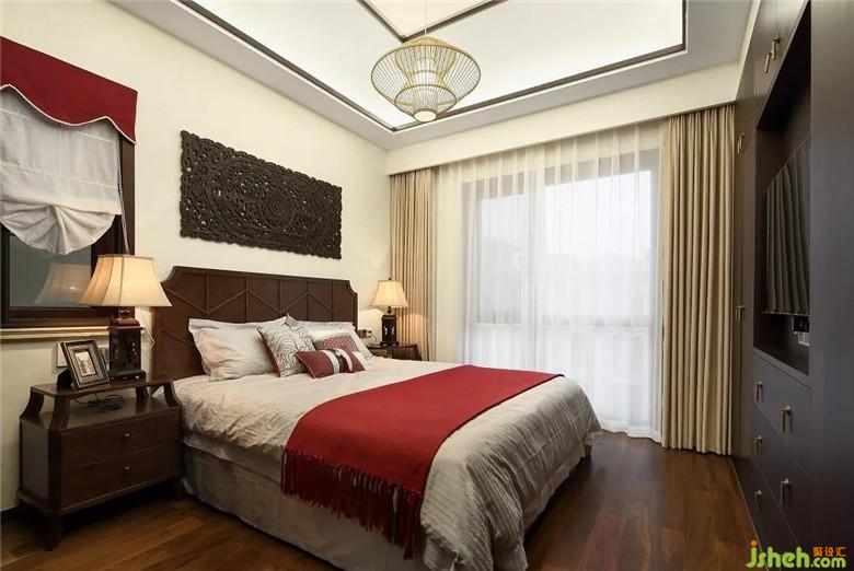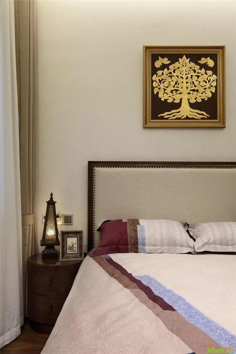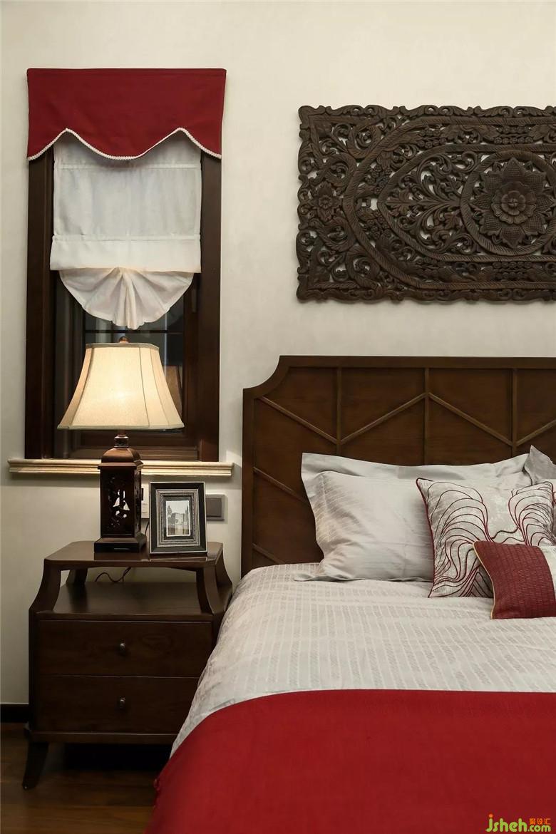 床頭柜泰式臺(tái)燈、頂面藤編吊燈,主臥室的原始建筑窗室內(nèi)設(shè)計(jì)師采用東南亞傳統(tǒng)的窗簾樣式進(jìn)行裝飾,彼此相映成輝。