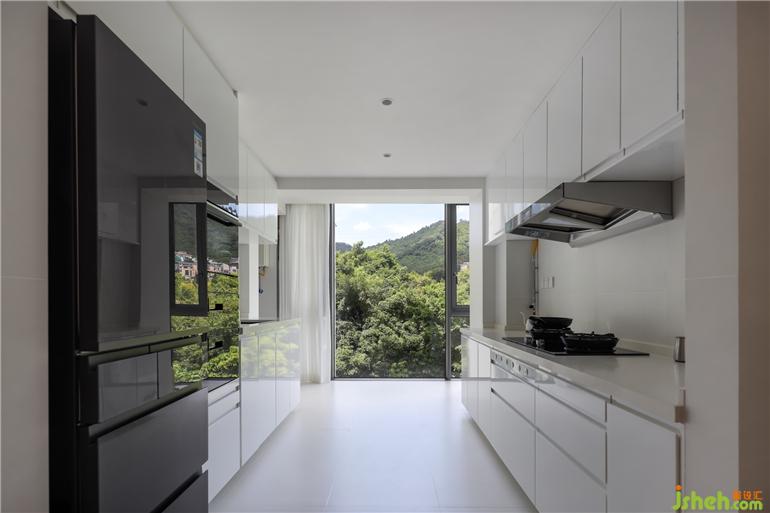 餐廳是空間的焦點,橫向空間的延伸,為開放式餐廚提供舒展愉悅的用餐環(huán)境。私宅設(shè)計深色置物柜點綴其中,木色餐桌椅搭配銀色金屬吊燈,不同材質(zhì)和色彩的碰撞平衡了空間視覺,呈現(xiàn)出豐富的層次感。一體化嵌入式的簡約櫥柜設(shè)計,與整體空間氛圍和諧呼應(yīng)。廚房另一端為洗衣區(qū)域,不同空間相互流動,收放有序。