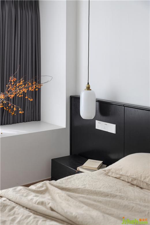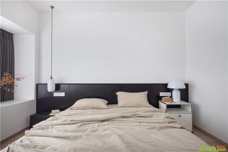 主臥通過橫向大衣帽柜的置入,構(gòu)成衛(wèi)生間于一體的套房式空間。私宅設(shè)計延續(xù)低飽和的色彩系統(tǒng),米色棉麻床品、白色燈具,搭配深色系窗簾、木紋理床具,不張揚的氛圍,塑造靜謐的睡眠環(huán)境,呈現(xiàn)質(zhì)樸、沉淀的韻律。