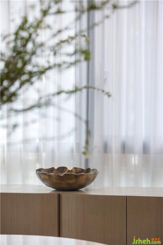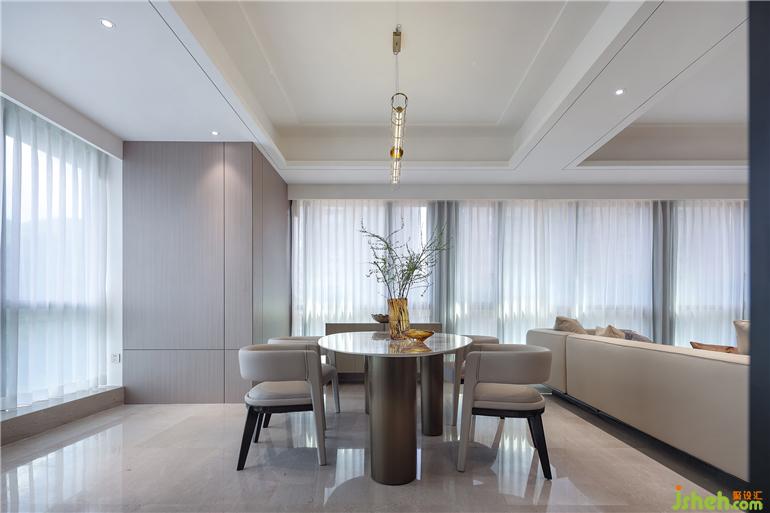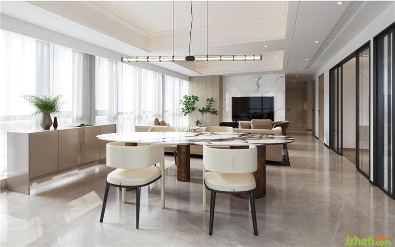 設(shè)計(jì)師關(guān)注軟裝細(xì)節(jié)的連續(xù)性,以此凸顯視覺延展的意趣?;⌒螏r板餐桌搭配白色圍合式皮紋餐椅,橘棕色玻璃花器點(diǎn)綴其中,木色餐柜與墻面色彩呼應(yīng)。大平層裝修設(shè)計(jì)圓筒狀吊燈灑下柔和的光線,簡(jiǎn)潔的色彩,多層次的材質(zhì)串聯(lián)起一日三餐的儀式感。