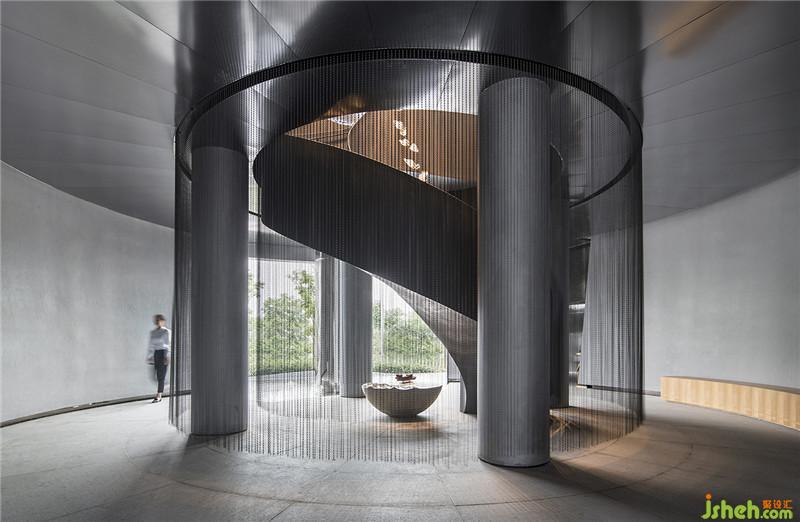 入口以一道旋轉(zhuǎn)的天梯作為啟始,每一步都像走在水流之中,光線透過垂簾每一步的影子都有不同的感受