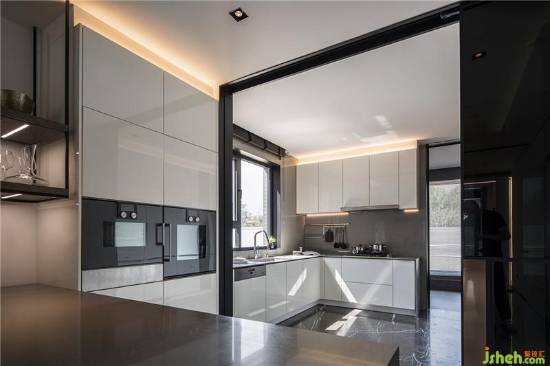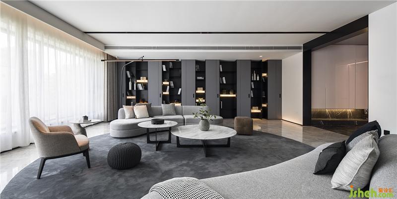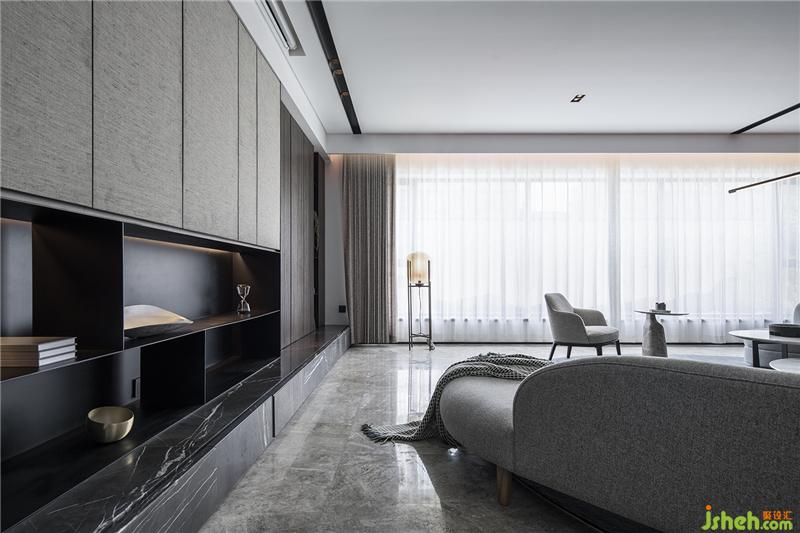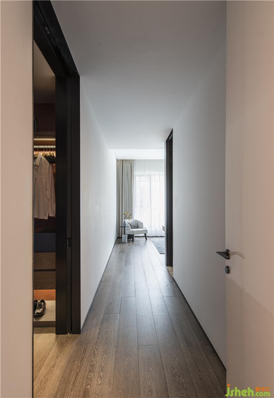 一入玄關(guān)即為一開(kāi)放空間,客聽(tīng)、玄關(guān)、走廊、餐廳,用微建筑的概念創(chuàng)造出一條私密的軸線,最適當(dāng)?shù)膶菍釉撚械臋C(jī)能,都縝密的收在這條軸線,合于空間。承襲著樣板間的脈絡(luò),將現(xiàn)代/簡(jiǎn)單/純粹/人文/生活等元素用更大的建筑語(yǔ)匯去執(zhí)行整個(gè)平層空間,用機(jī)能化的柜體創(chuàng)造室內(nèi)建筑般的量體、軸線等概念??吐?tīng)大面積的書(shū)墻除了造型層面之外,更加賦予空間產(chǎn)生在人文方面的強(qiáng)烈氣息。
