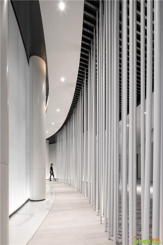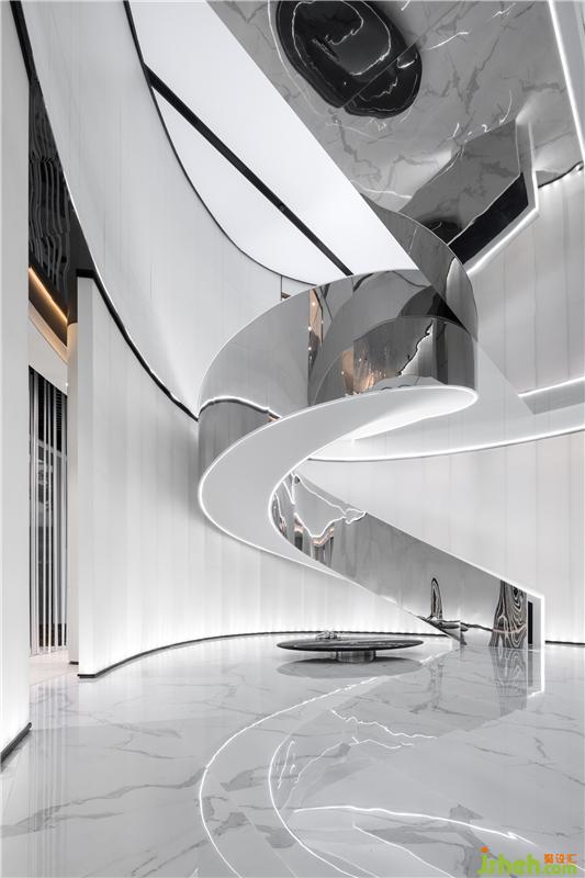在入口空間,設(shè)計師以「穿透介質(zhì),模糊空間邊界」為架構(gòu),由一樓天方地圓的形式展開,打破既有軸線的安排,利用弧線型的動線活躍空間的體驗感。室內(nèi)設(shè)計師