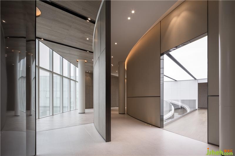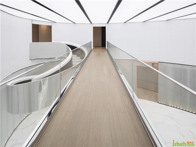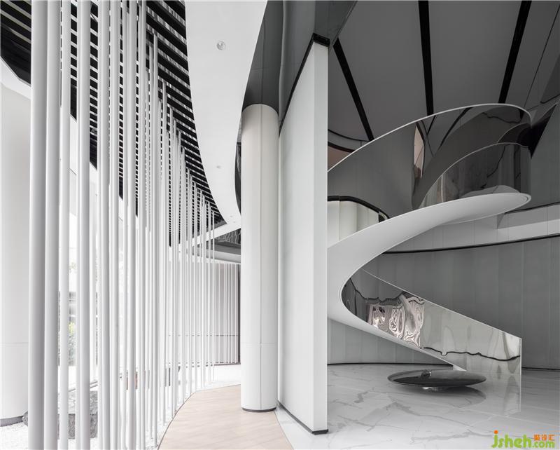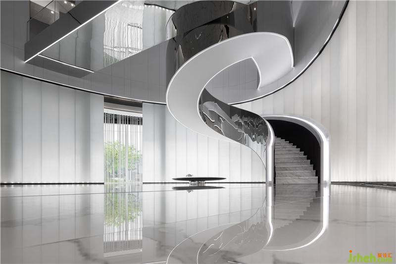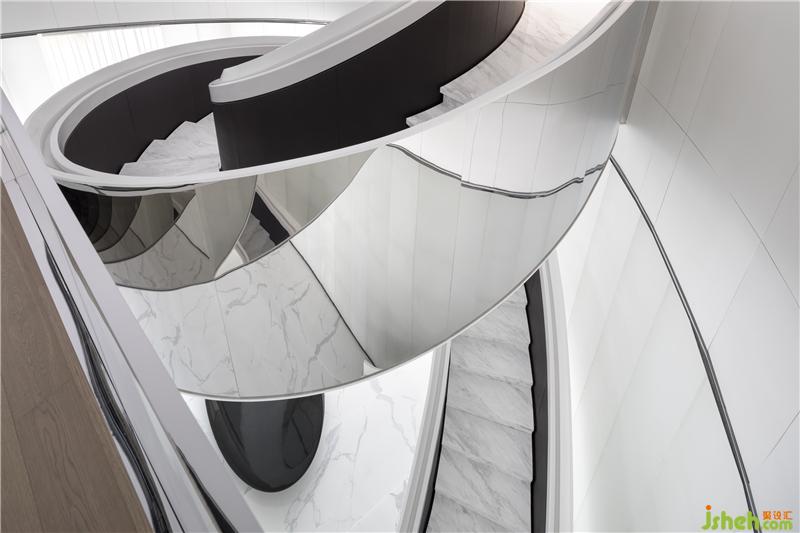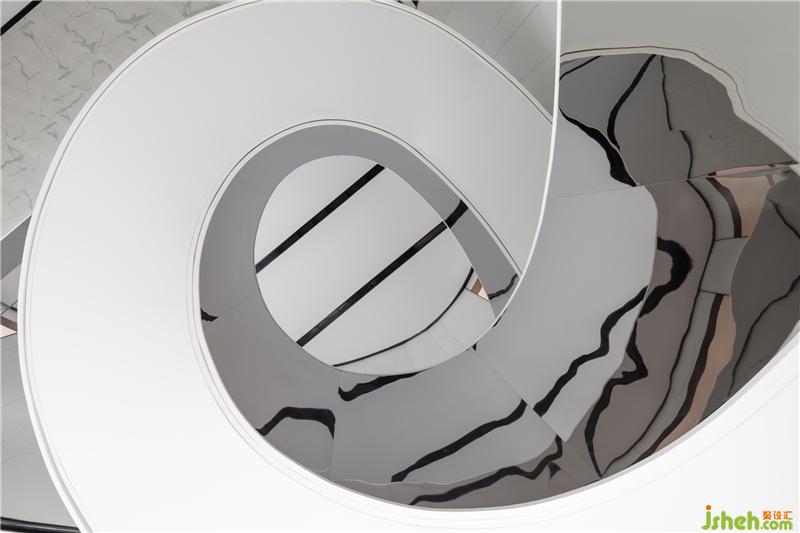 螺旋反射的結(jié)構(gòu)體模糊既定樓梯的剛直生硬印象,又透過(guò)象征合流的曲線角度,引景入室。室內(nèi)設(shè)計(jì)師
