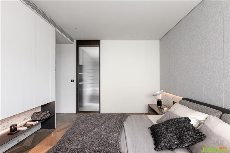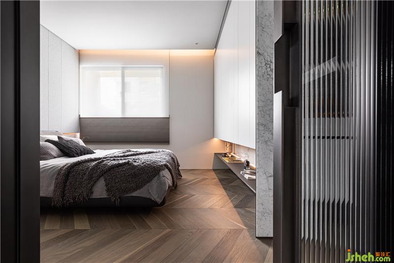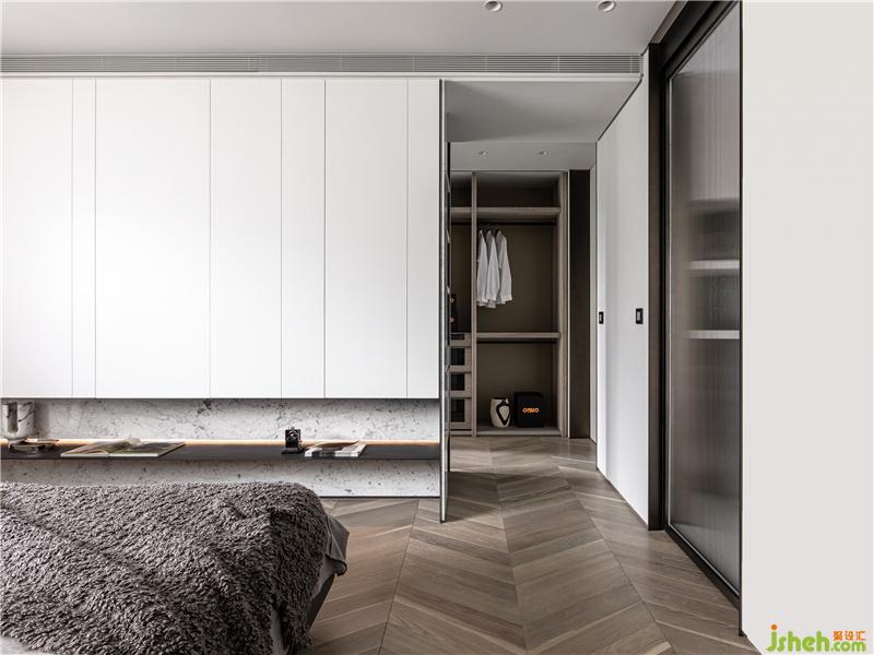 主臥入門為開放式衣帽間,一眼望穿的是二樓獨(dú)有的綠色樹梢窗景。床頭主墻簡潔的繃布分割與石材背墻,反映簡單舒適的生活調(diào)性。