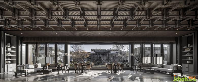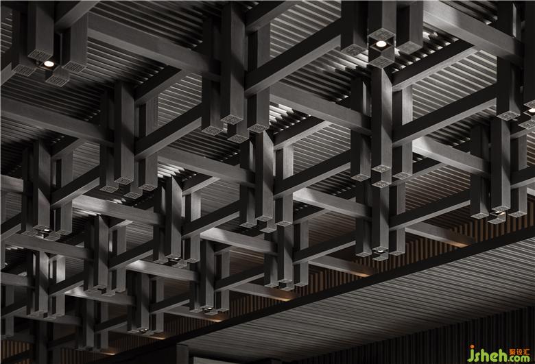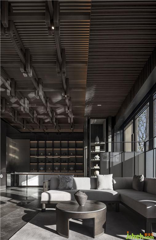 天花木結(jié)構(gòu)采用傳統(tǒng)的“榫卯”序列,上下層級的疊合關(guān)系,陰陽相合,明暗相成,既是建筑中的藝術(shù),也同時傳達(dá)著東方的哲學(xué)內(nèi)蘊。接待區(qū)空間布置提煉于五代·顧閎中的《韓熙載夜宴圖》,透過屏風(fēng)、沙發(fā)、長案的自由組合,形成賓主得當(dāng),疏密有致禮儀空間,運用傳統(tǒng)東方的畫屏,形成空間的界定,讓整體的視線與內(nèi)庭外園形成空間的聯(lián)結(jié),傳達(dá)東方文雅精致的精神內(nèi)涵。