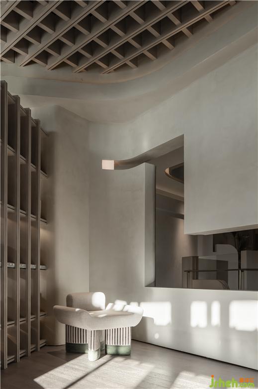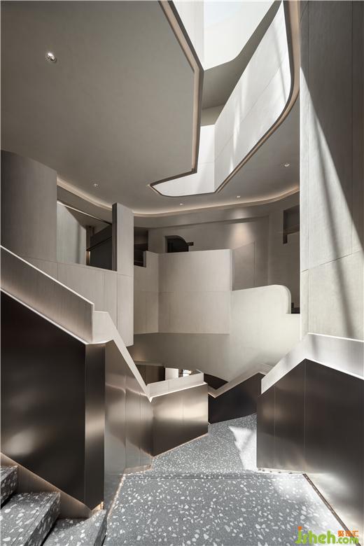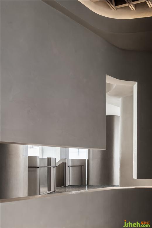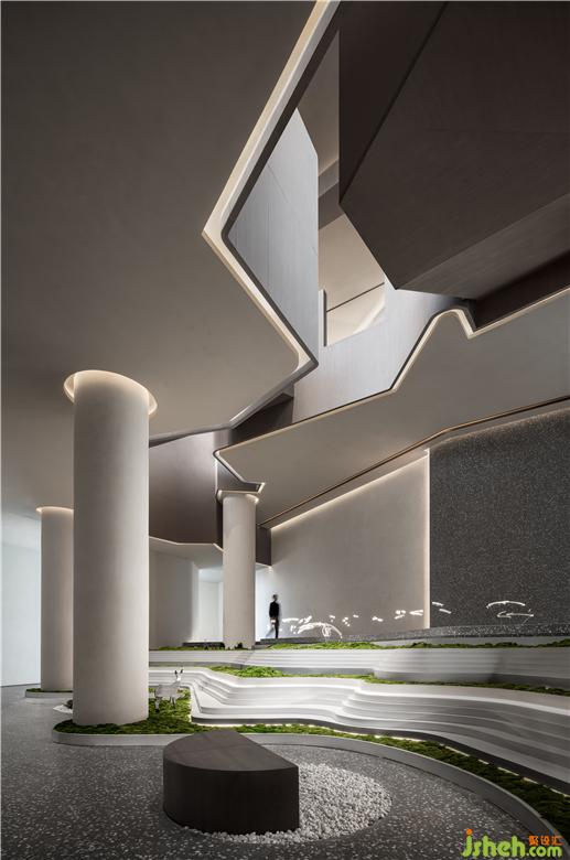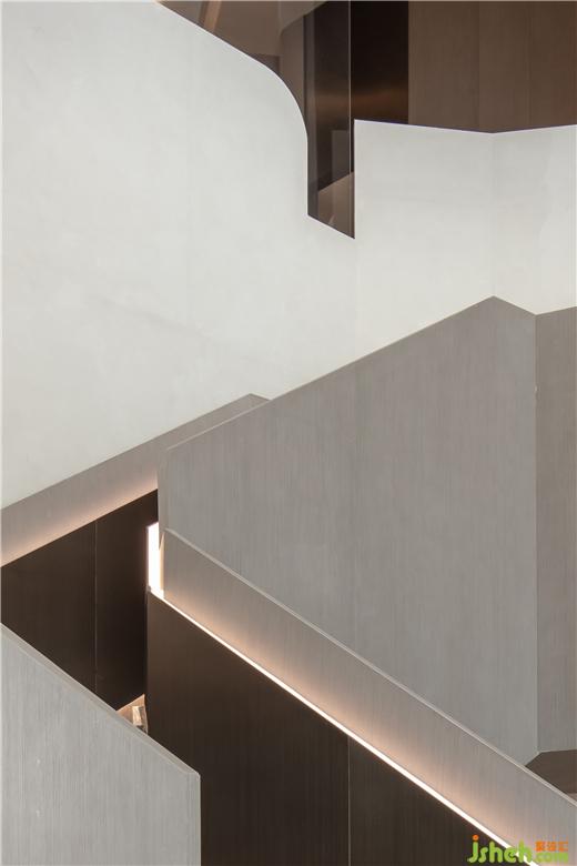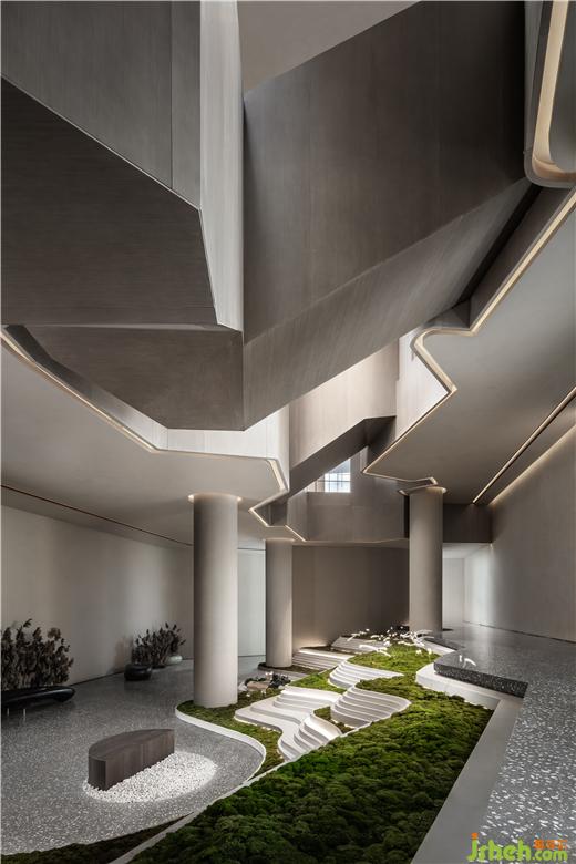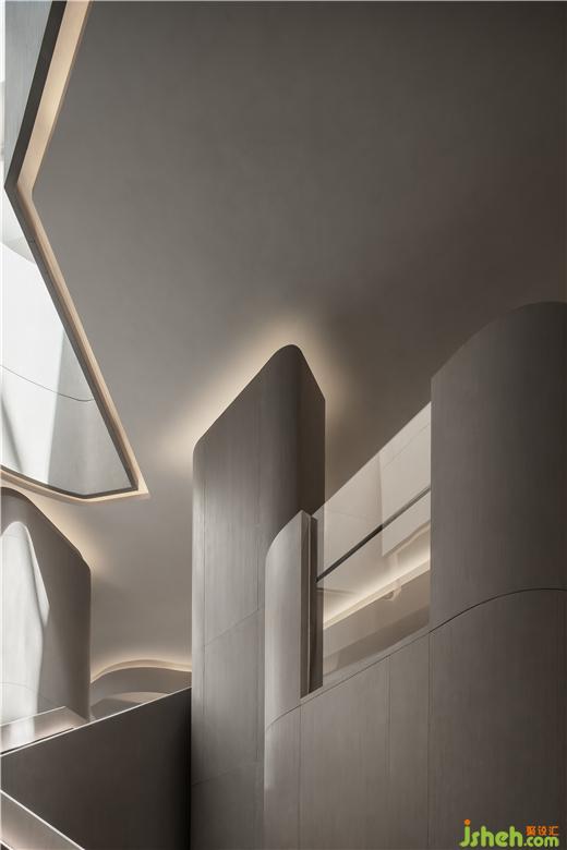 室內(nèi)設(shè)計(jì)貫穿了折面與弧線的型態(tài),以體塊分明的形式處理,結(jié)合局部開槽、疊加、牽引的設(shè)計(jì)手法,讓建筑體態(tài)在空間中自然的伸展。在整體的空間基調(diào)上,光照而折射的建筑塊體跟隨著折面的線條進(jìn)行延展,同時營造出具有現(xiàn)代極簡和未來消隱的不同感受,形容為「城市山谷的」氣場,未來…幽靜深遠(yuǎn)。峽谷間應(yīng)型而就溪流以及峽谷間翻流沖突的煙霞風(fēng)云仿佛要掙脫峽谷型體界定的桎梏,思考呈現(xiàn)冷靜、舒適的空間感受,視覺效果上大方,相互結(jié)合營造出屬于建筑的生命力與深度。