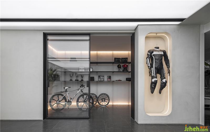 車庫以鏡面與軟膜天花為主軸 ,并在一旁的展示區(qū),懸掛賽車衣,獲獎(jiǎng)獎(jiǎng)牌,透過灰鏡與鐵件層架反射延伸,凸顯屋主藏車與收藏品的冷冽科技感(玄關(guān))從車庫進(jìn)入玄關(guān),將地坪高低差化整為一,柜體量體與地坪脫開,聯(lián)結(jié)起玄關(guān)與交誼廳的關(guān)系。
