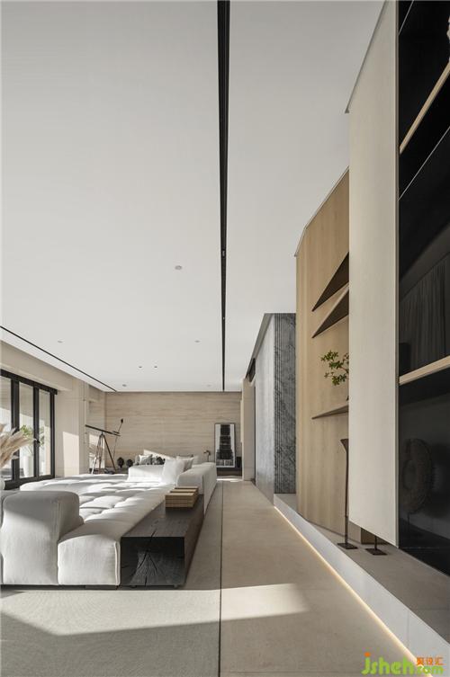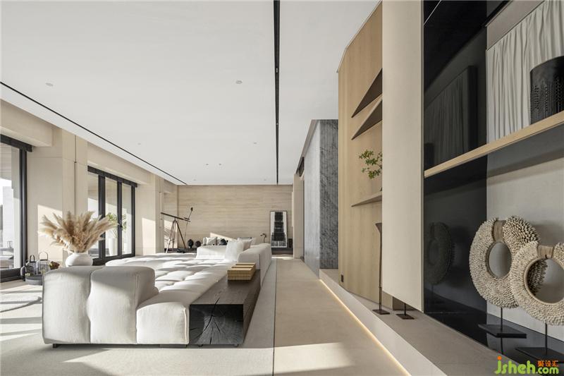 負(fù)一層社交區(qū)設(shè)定為招待賓客渡假的場(chǎng)域,運(yùn)用低調(diào)靜謐且最貼近自然的石材,依著大面積的落地窗,三亞樣板房設(shè)計(jì)灑落進(jìn)室內(nèi)的光影刻劃在石材溫潤的肌理上, 因應(yīng)三亞潮濕的天氣,貼心的將地毯設(shè)定為固定的pvc材質(zhì)塊毯,好清理且不會(huì)發(fā)霉的材質(zhì),讓財(cái)質(zhì)化分出沙發(fā)區(qū)域,相較于石材,在肌膚的接觸塊毯更加溫暖,或坐或躺,生活面相更加多元。