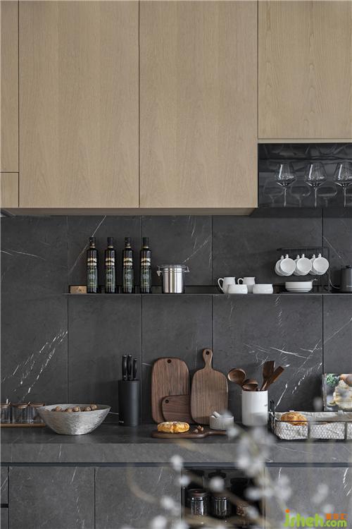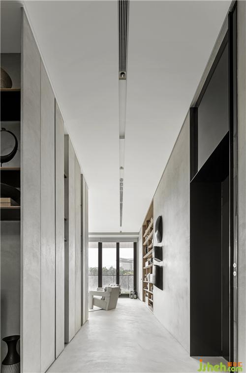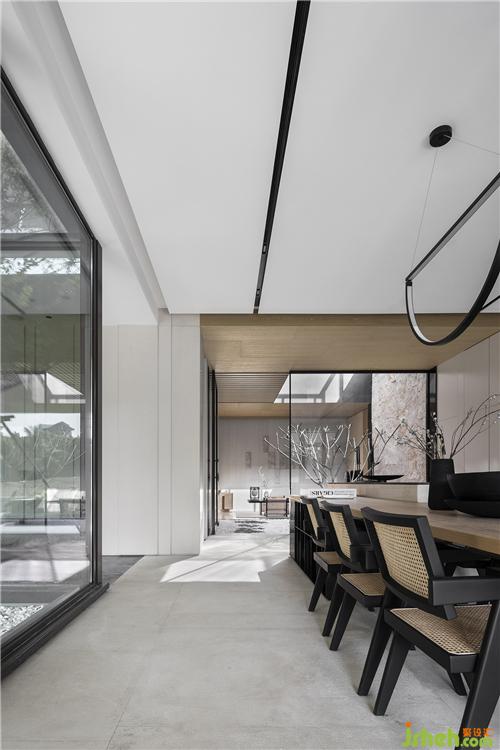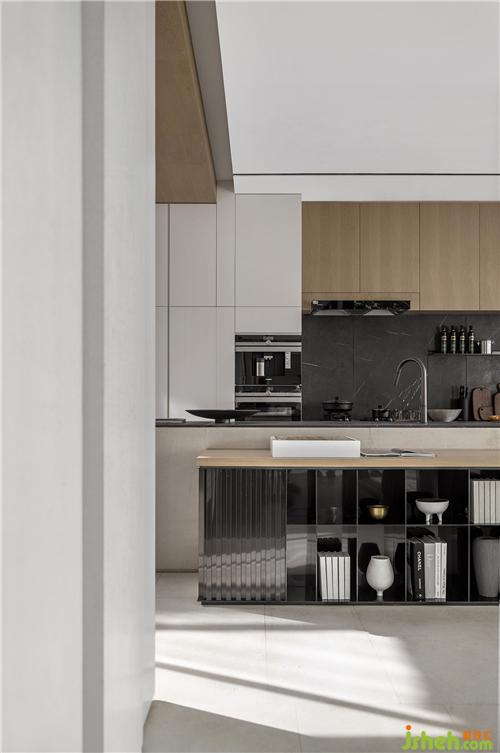 透過長廊凹凸進退墻面的引導,我們來到開放式的西廚區(qū)域,前后穿透的空間感,