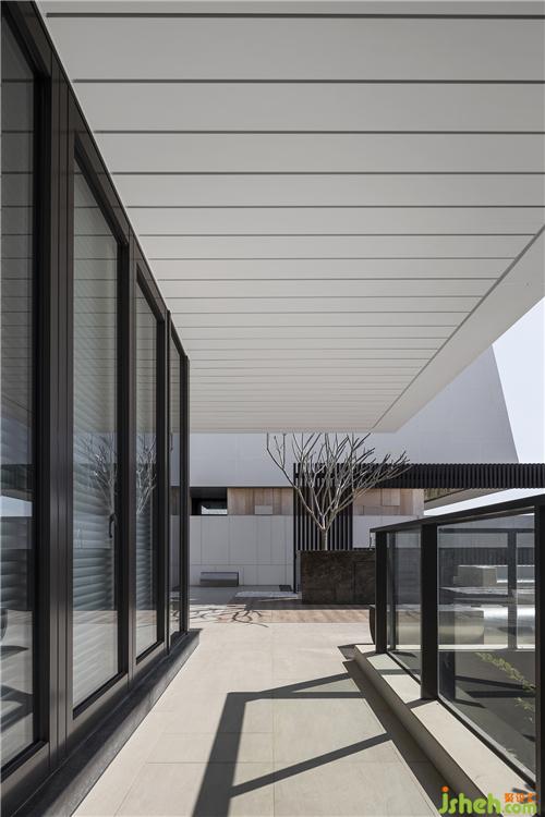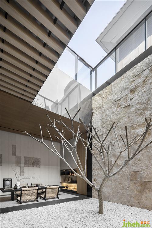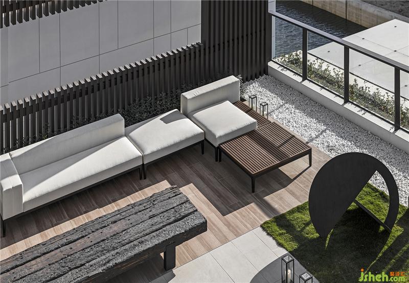 從茶室穿越到戶外泳池,賓客用餐舉辦派對的同時,可享有前后兩端不同的景觀河水潺潺流動的聲音,乘著風穿過泳池流進耳里,后方茶室靜謐的氛圍,光線被樹葉打散灑落在地面上,映著最深沉的石紋。