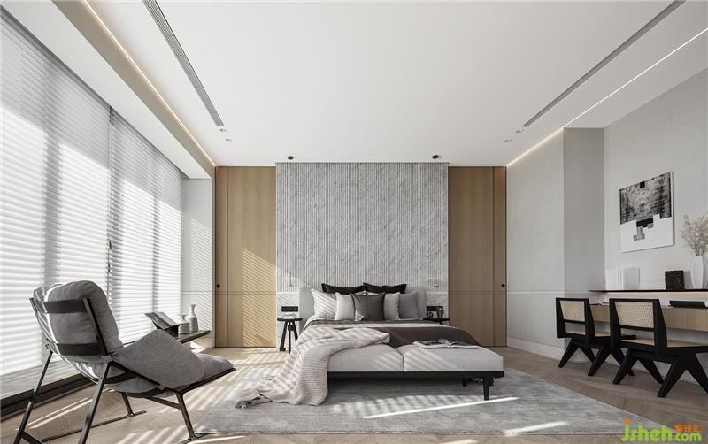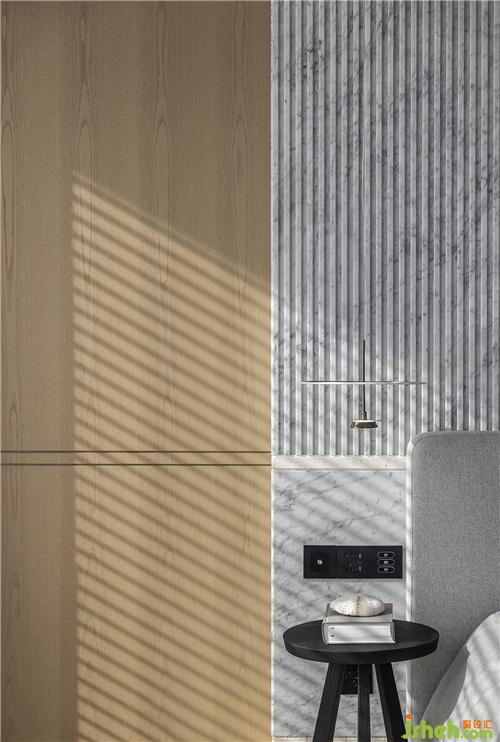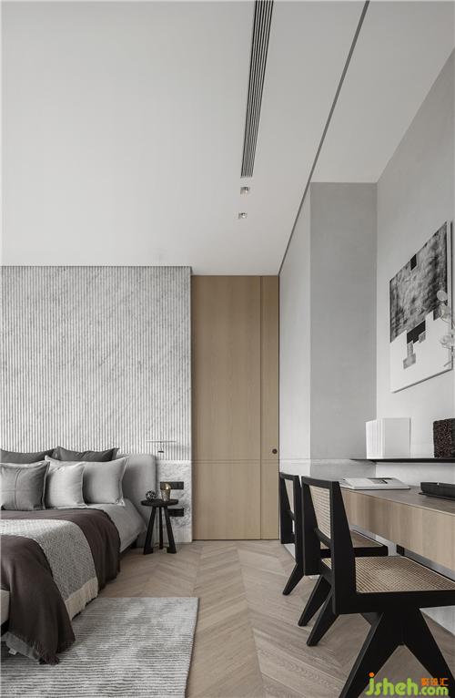 床頭背墻使用魚(yú)肚白格柵,搭配整室的石材腰線(xiàn),抓出壁面比例,沉穩(wěn)色調(diào)的床具,讓睡眠及休憩成為臥房中的主角。