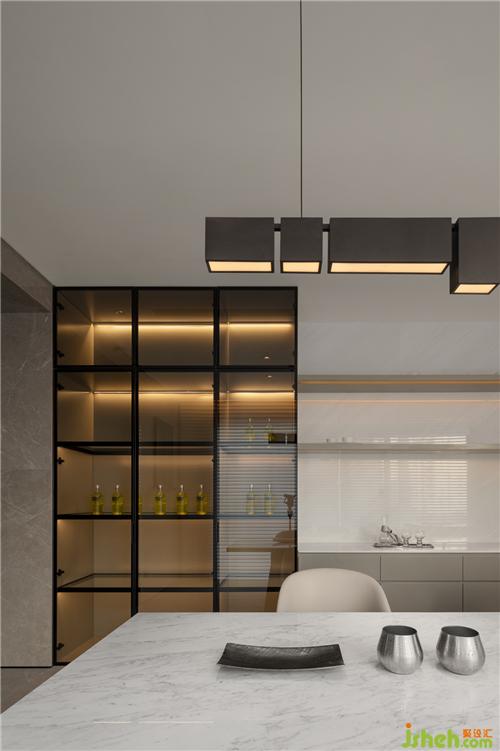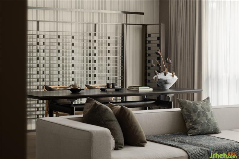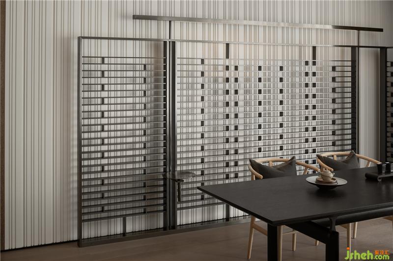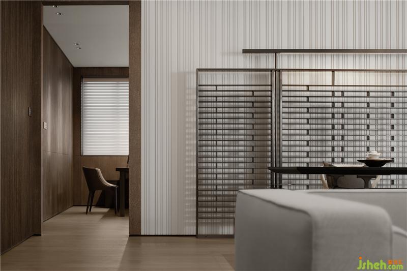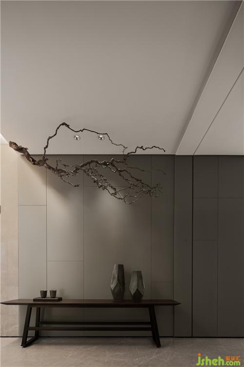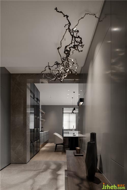 以松柏枝作為暗示、提醒,在入戶玄關(guān)的短暫停留與接收,達(dá)到轉(zhuǎn)換場(chǎng)景的效果,??跇影宸吭O(shè)計(jì)配合墻體分割與延伸,細(xì)節(jié)變化中區(qū)分不同的動(dòng)線,平面配置上以玄關(guān)起始的動(dòng)線左右區(qū)分主客感。