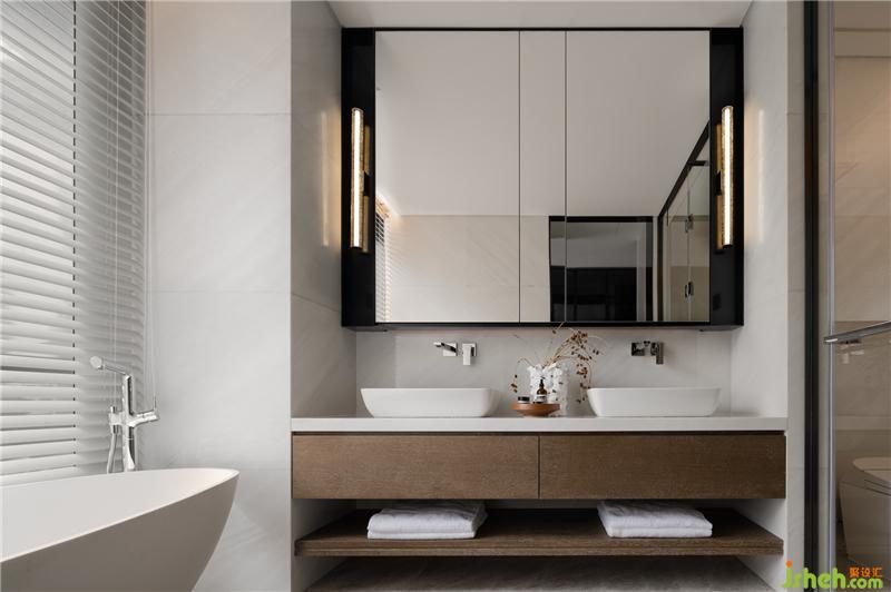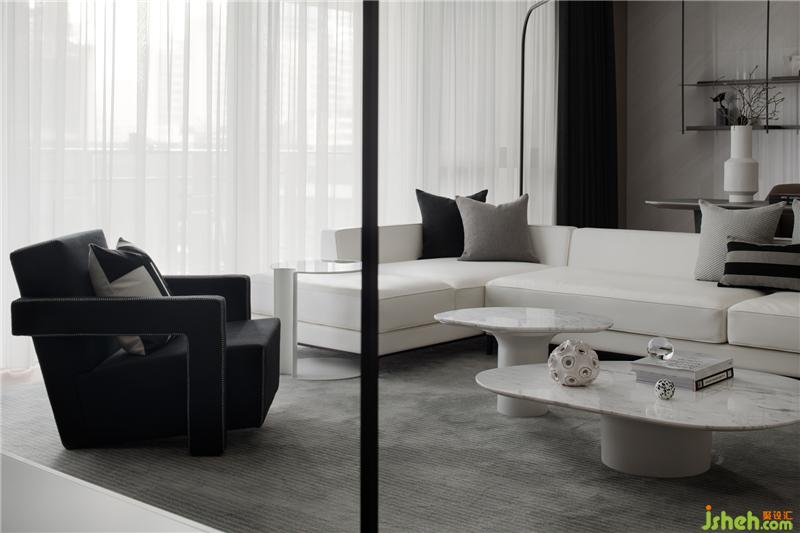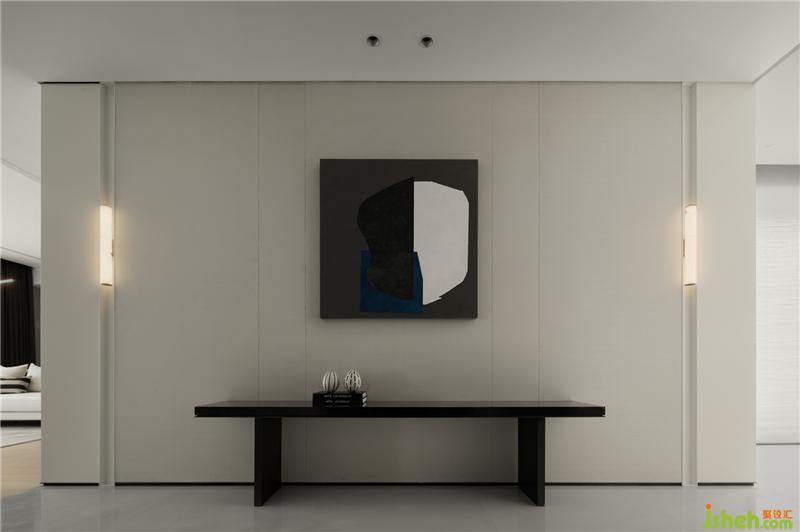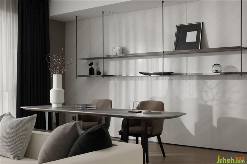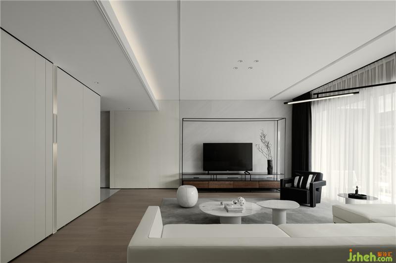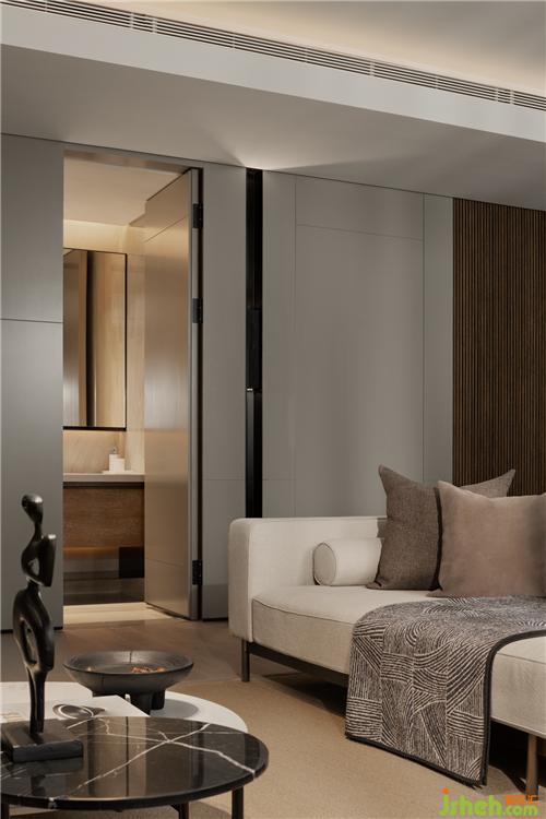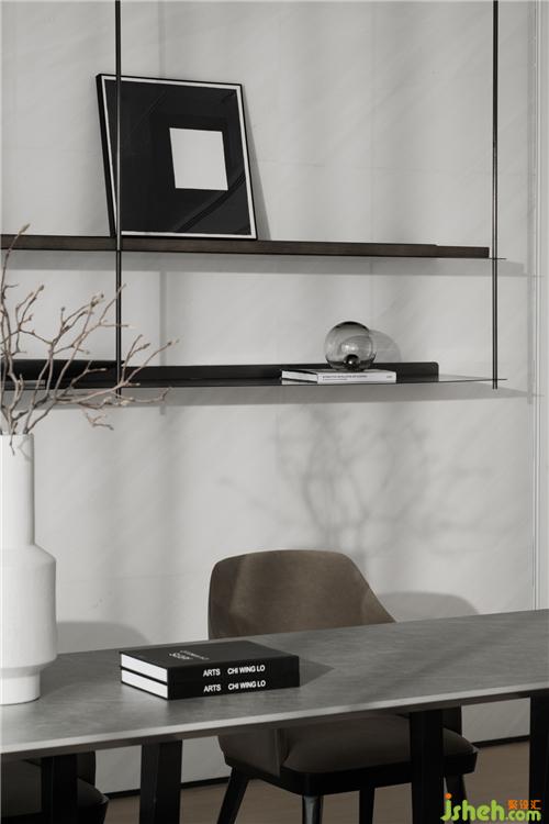 以局部鐵件裝飾,利用局部鍍鈦的點(diǎn)綴深色元素,??跇影宸吭O(shè)計(jì)平衡空間的重量與色彩,軸線延伸、通透的設(shè)計(jì)。