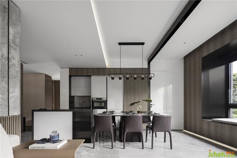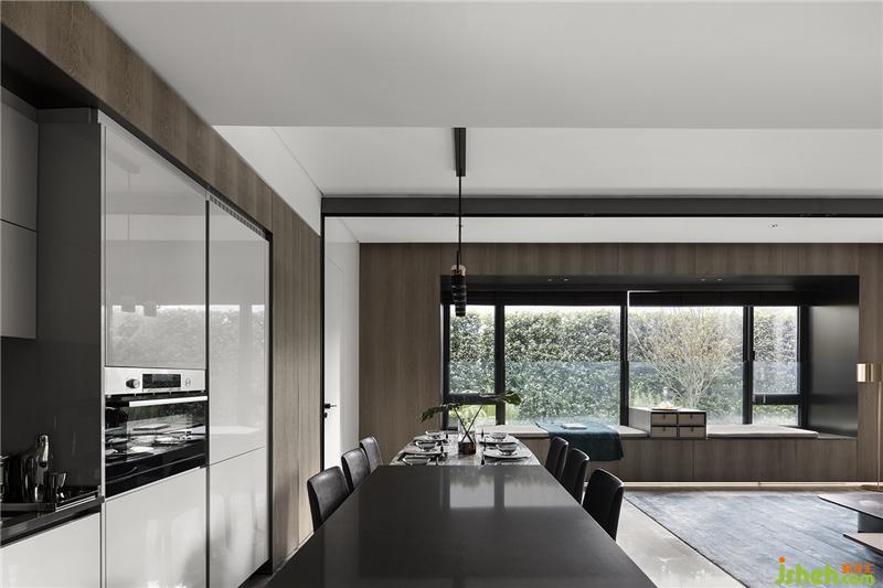 通過大氣的金屬噴黑邊框黑玻璃拉門,可開闔的廚房活動式彈性空間深圳樣板房設(shè)計,減去了厚重的墻面隔屏同時降低視覺重量。