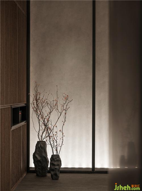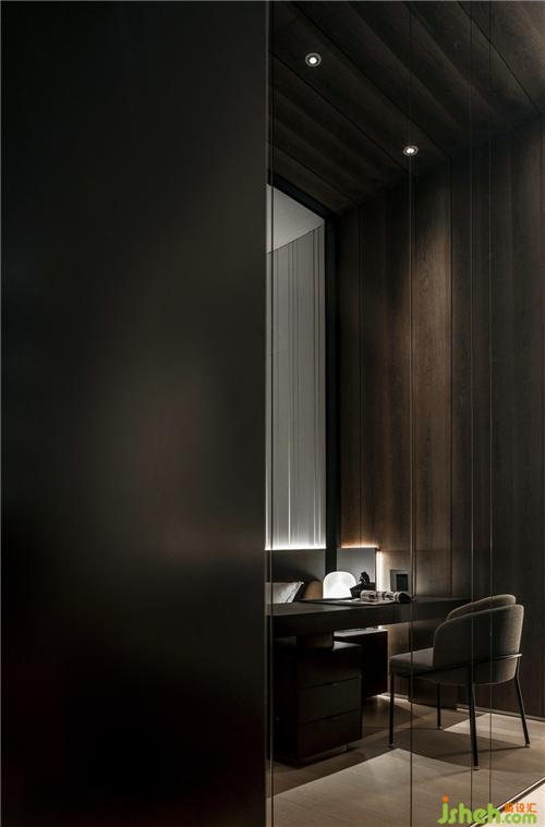 更衣間弧型交錯(cuò)的造型天花板延續(xù)整體空間的造型元素,開(kāi)放的柜體讓狹長(zhǎng)走到得以釋放空間,鐵件吊件的造型,展現(xiàn)柜體的輕盈感,減少更衣間的壓迫,皮革的背板增加柜體的質(zhì)感。臥室白色烤漆墻面,墻面線(xiàn)條的分割增加空間的表情,床頭深色皮革背板搭配一旁木皮的溫潤(rùn),像個(gè)女孩般,有非凡的氣質(zhì),高冷的儀態(tài),優(yōu)雅的姿勢(shì),炙熱的內(nèi)心