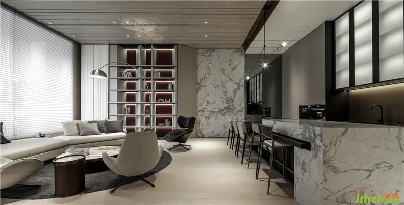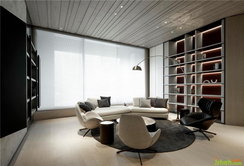 進(jìn)到展廳第一個(gè)空間,赭紅色的皮革強(qiáng)化整體視覺(jué)焦點(diǎn),白色石材與淺色木皮襯托出空間的優(yōu)雅氣質(zhì),也讓空間更凸顯的紅潤(rùn),香檳金屬的面材,隱約帶出空間的低調(diào)奢華,圓弧沙發(fā)帶出空間的恣意盎然,沙發(fā)后方柜體斜板造型,創(chuàng)造出柜體的律動(dòng)感,也增加空間中不同面向的造型語(yǔ)匯。