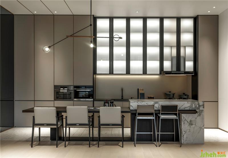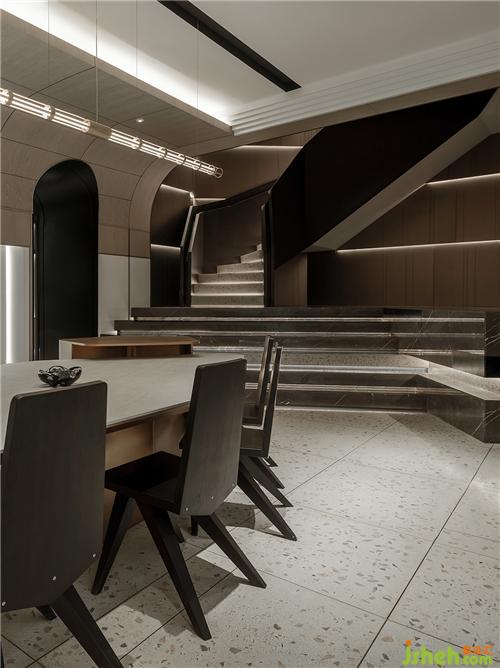 At the first space of the exhibition room, the ocher red leather strengthens the overall visual focus. The white stone and light-color veneer reveal the elegant atmosphere and highlight the rosy colors of the space. The champagne gold material indistinctly shows the low-profile luxury of the space. The arc sofa displays unrestrained exuberance. The slanting board style of the cabinet behind the sofa creates a sense of rhythm and increases the style lexicons of the different perspectives in the space.