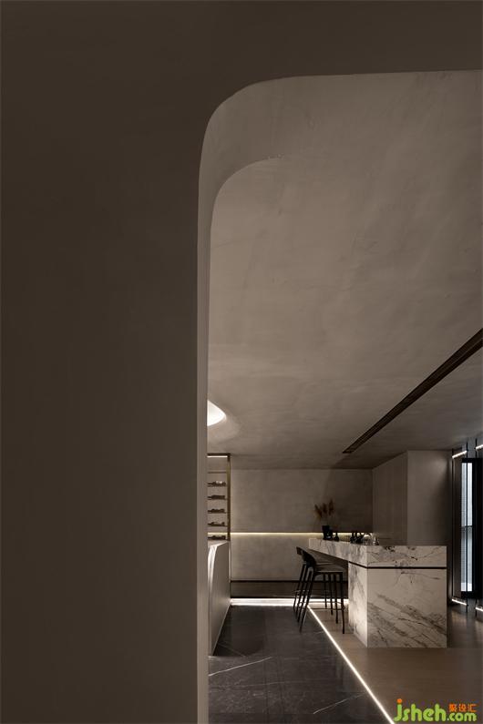 光線可以賦予空間無限想象,采光讓陽光肆意地在室內(nèi)自由跳躍。開放的客餐廳格局中,藝術(shù)格調(diào)的微水泥鋪展開來,不同灰色的明度關(guān)系與冷暖關(guān)系被精心安排。