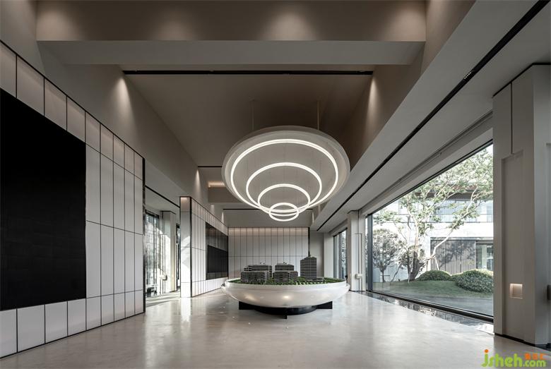 沙盤(pán)與天花裝置由浮空島嶼演變而成,上下合圍的體塊與室外的山水畫(huà)境對(duì)應(yīng),通過(guò)仿若巨幅畫(huà)框的幕墻進(jìn)行融合轉(zhuǎn)換,又歸于盡頭,兩兩相對(duì)。